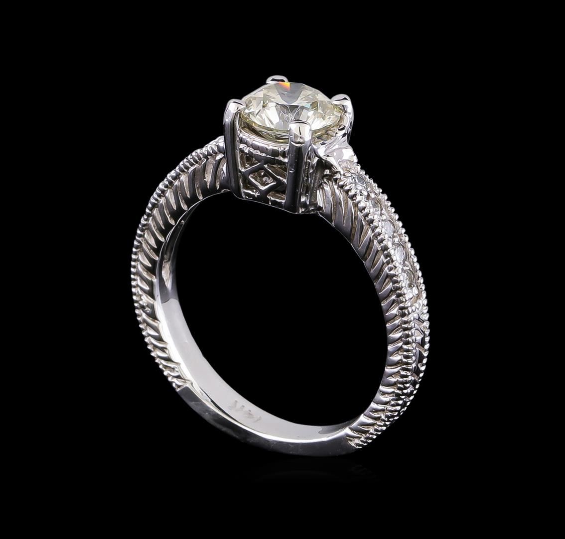 One electronically tested 14KT white gold lady's cast wedding ring with a cathedral shank with a bright polish with milgrain detailing finish. The featured lady's ring has a shank measuring 2.76 millimeters in width. Identified with markings of "14K". Condition is new, good workmanship. Containing: One prong set round brilliant cut diamond, measuring 6.48 - 6.46 x 4.20mm (depth est.) approximate weight of 1.09ct. Graded in the setting. Clarity: SI-1. Color: I - Very Good Ten prong set round brilliant cut diamonds, measuring 1.60 - 1.50 x 0.96mm (depth est.) approximate total weight of 10 Stones = 0.15ct. Graded in the setting. Clarity: SI-1 to SI-2. Color: G - Good. Total Weight of Diamonds 1.24ct. Total Weight of Ring 4.60gm GAS Appraised at $15,140.00.
