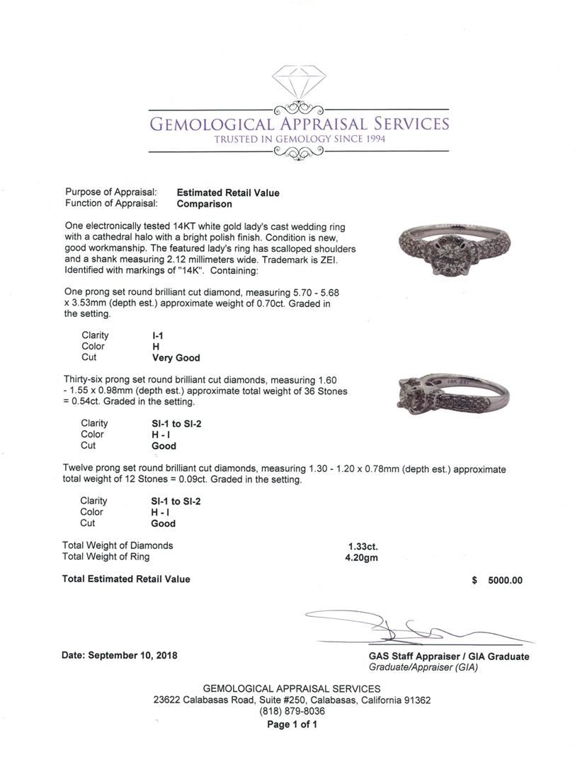 One electronically tested 14KT white gold lady's cast wedding ring with a cathedral halo with a bright polish finish. The featured lady's ring has scalloped shoulders and a shank measuring 2.12 millimeters wide. Trademark is ZEI. Identified with markings of '14K'. Condition is new, good workmanship. Containing: One prong set round brilliant cut diamond, measuring 5.70 - 5.68 x 3.53mm (depth est.) approximate weight of 0.70ct. Graded in the setting. Color H Clarity I-1 Cut Very Good Thirty-Six prong set round brilliant cut diamonds, measuring 1.60 - 1.55 x 0.98mm (depth est.) approximate total weight of 36 Stones = 0.54ct. Graded in the setting. Color H - I Clarity SI-1 to SI-2 Cut Good Twelve prong set round brilliant cut diamonds, measuring 1.30 - 1.20 x 0.78mm (depth est.) approximate total weight of 12 Stones = 0.09ct. Graded in the setting. Color H - I Clarity SI-1 to SI-2 Cut Good. Total Weight of Diamonds 1.33ct.. Total Weight of Ring 4.20gm GAS Appraised at $5000.00. GAS Appraised at $5,000.00.