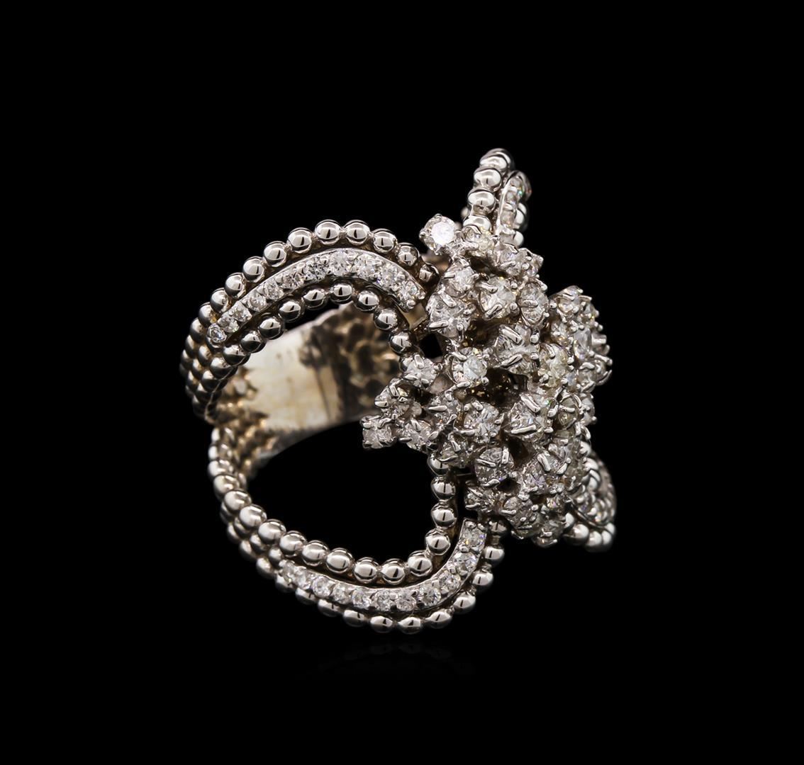 One electronically tested 14KT white gold ladies cast & assembled diamond ring with a bright polish finish. The ring features an organized diamond cluster supported by elaborate diamond set split shoulders with beaded detailing, completed by a six millimeter wide band. Identified with markings of "14K". Condition is new, good workmanship. Containing: Eighty-Two prong set round brilliant cut diamonds, measuring 2.20 - 1.20 x 1.02mm exact total weight 82 Stones = 1.24ct. Graded in the setting. Clarity: SI-1 to I-1. Color: G - I. Total Weight of Diamonds 1.24ct. Total Weight of Ring 8.47gm. AIG Appraised.