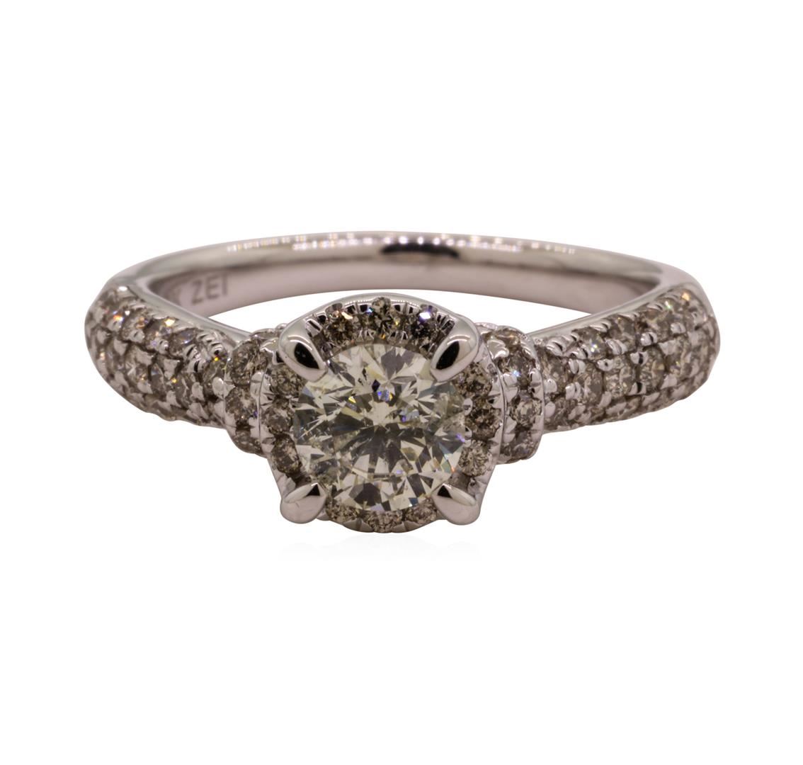 One electronically tested 14KT white gold lady's cast wedding ring with a cathedral halo with a bright polish finish. The featured lady's ring has scalloped shoulders and a shank measuring 2.12 millimeters wide. Trademark is ZEI. Identified with markings