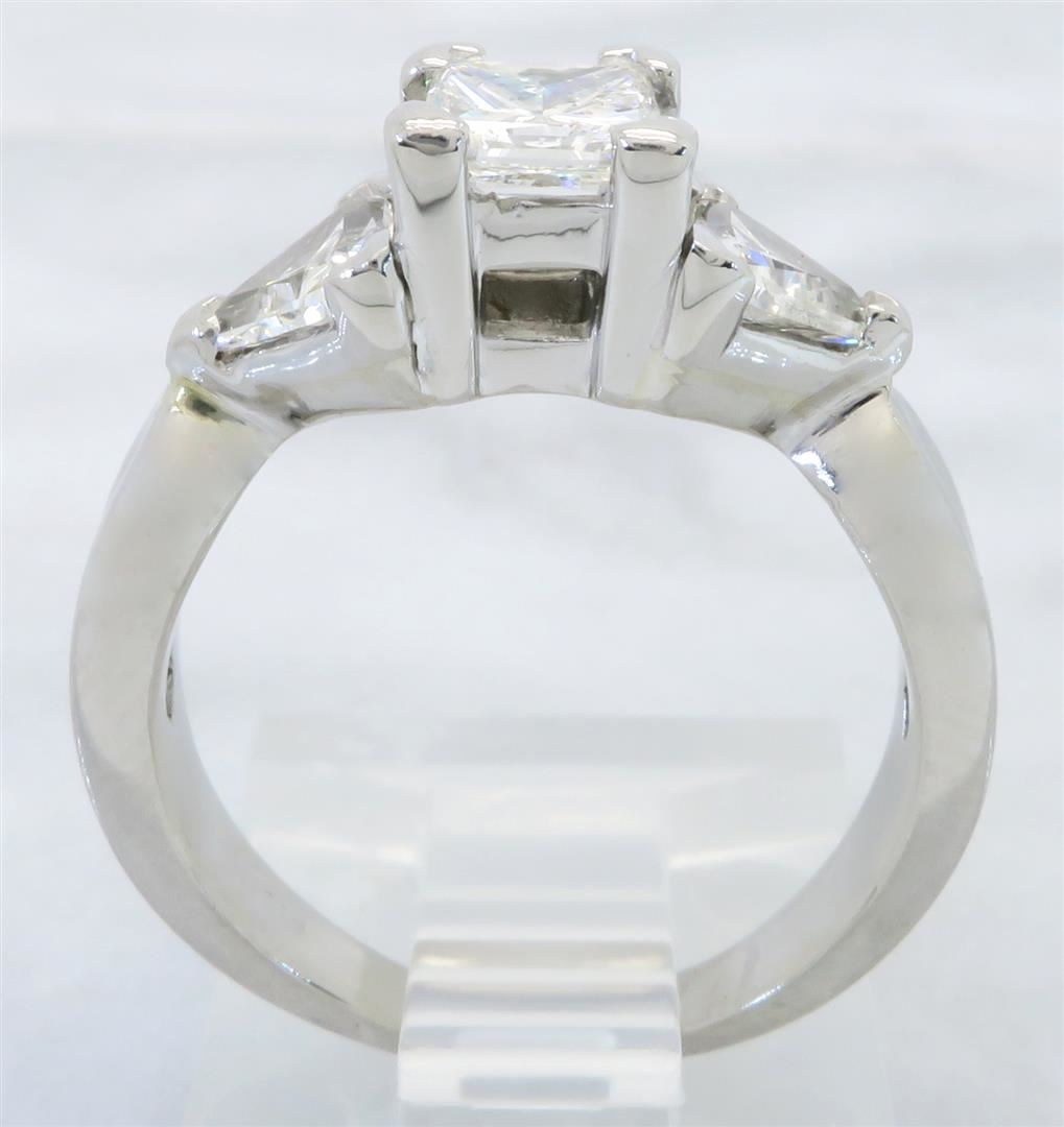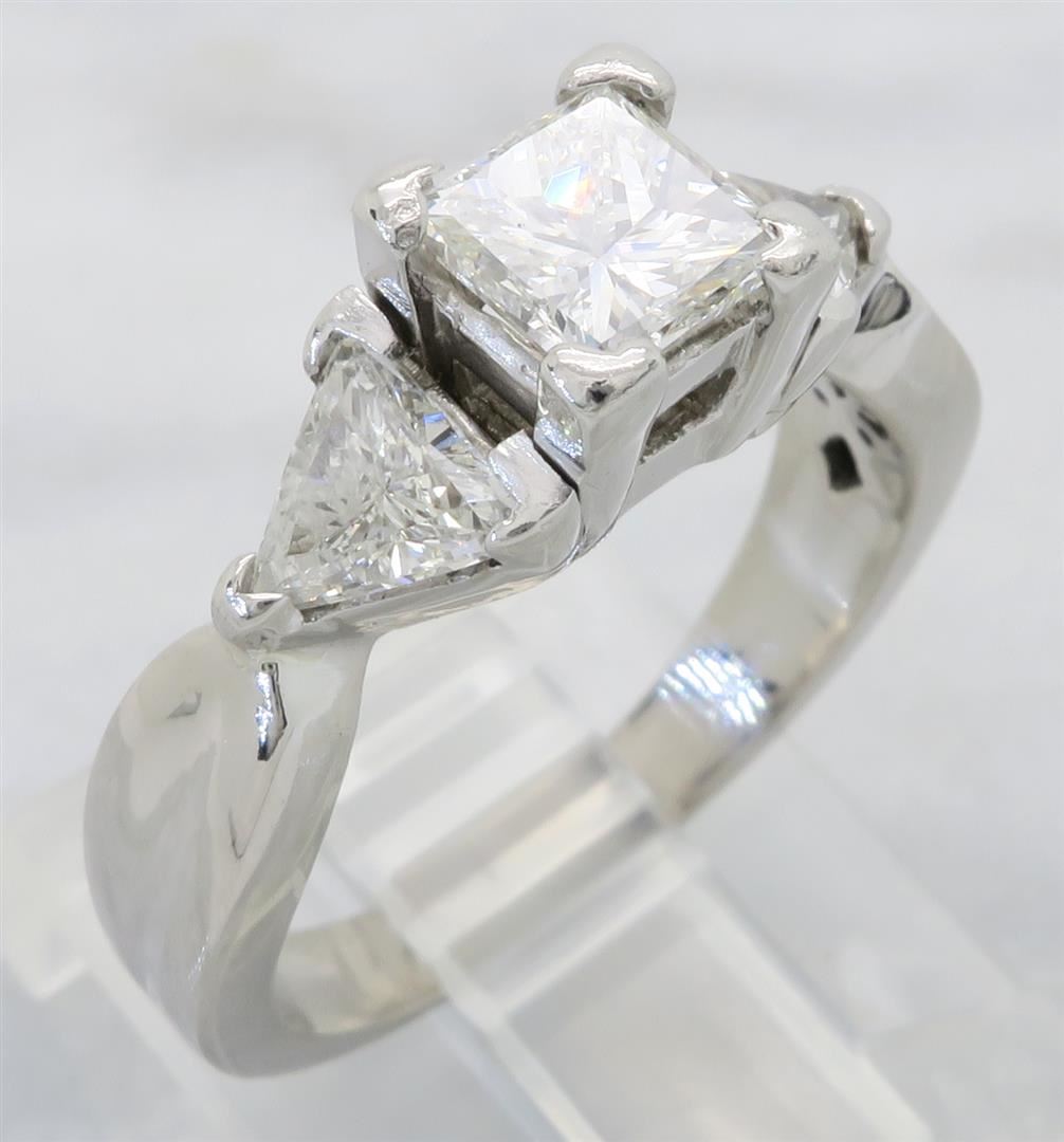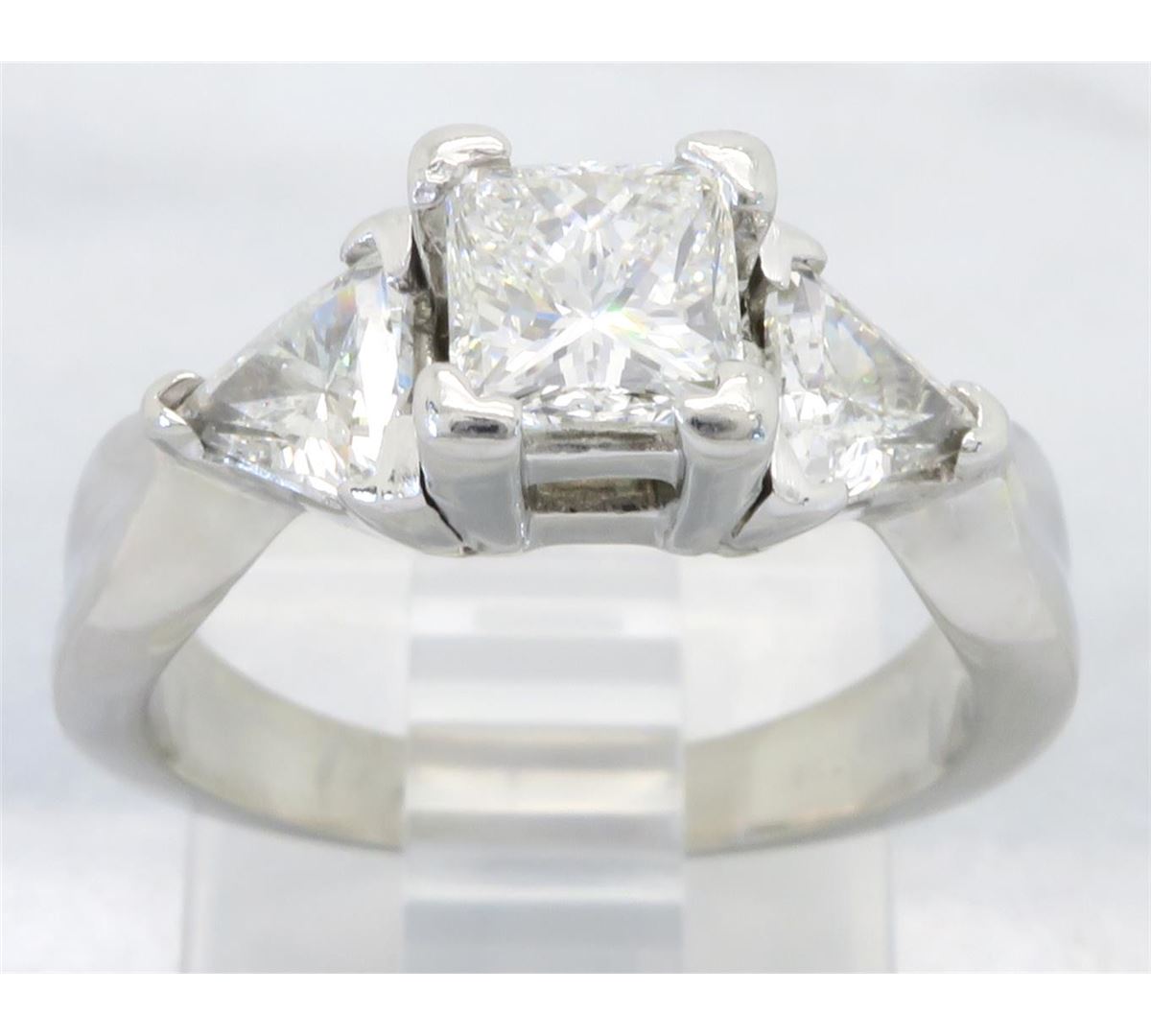 One tested platinum diamond ring. Containing: One Princess Cut Diamond. Approximate Size: .70CT, Clarity: VS2, Color: H-I. Two Trilliant Cut Diamonds. Approximate total diamond weight: 1.24CTW. All diamonds are graded in the mounting unless otherwise stated. Weight of ring: 7.4 grams, Size: 5.5.