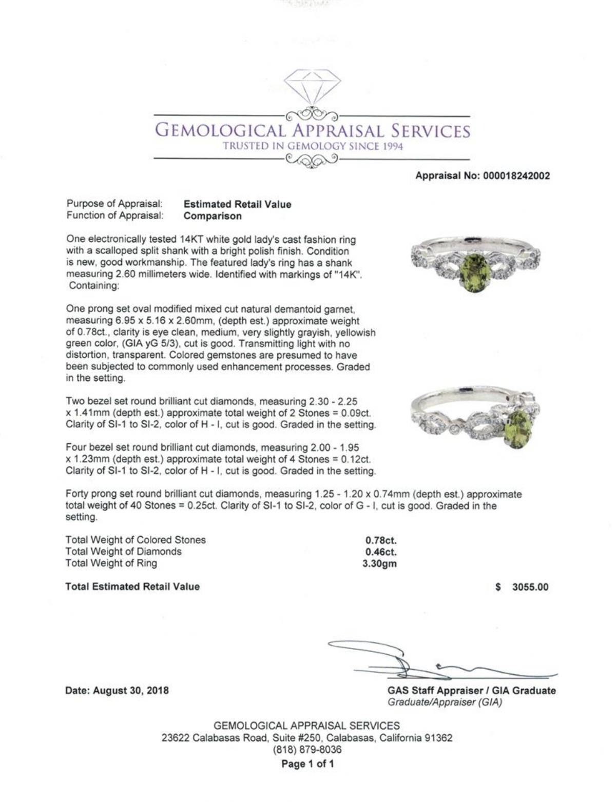 One electronically tested 14KT white gold lady's cast fashion ring with a scalloped split shank with a bright polish finish. The featured lady's ring has a shank measuring 2.60 millimeters wide. Identified with markings of '14K'. Condition is new, good workmanship. Containing: One prong set oval modified mixed cut natural demantoid garnet, measuring 6.95 x 5.16 x 2.60mm, (depth est.) approximate weight of 0.78ct., clarity is eye clean, medium, very slightly grayish, yellowish green color, (GIA yG 5/3), cut is good. Transmitting light with no distortion, transparent. Colored gemstones are presumed to have been subjected to commonly used enhancement processes. Graded in the setting. Two bezel set round brilliant cut diamonds, measuring 2.30 - 2.25 x 1.41mm (depth est.) approximate total weight of 2 Stones = 0.09ct. Graded in the setting. Color H - I Clarity SI-1 to SI-2 Cut Good Four bezel set round brilliant cut diamonds, measuring 2.00 - 1.95 x 1.23mm (depth est.) approximate total weight of 4 Stones = 0.12ct. Graded in the setting. Color H - I Clarity SI-1 to SI-2 Cut Good Forty prong set round brilliant cut diamonds, measuring 1.25 - 1.20 x 0.74mm (depth est.) approximate total weight of 40 Stones = 0.25ct. Graded in the setting. Color G - I Clarity SI-1 to SI-2 Cut Good. Total Weight of Colored Stones 0.78ct.. Total Weight of Diamonds 0.46ct.. Total Weight of Ring 3.30gm GAS Appraised at $3055.00. GAS Appraised.