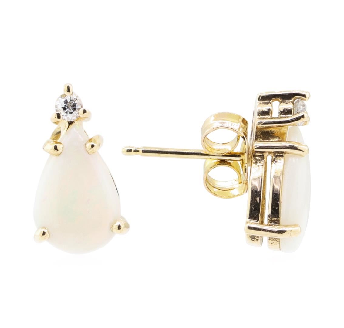 One pair of friction post earrings with baskets featuring: 14KT yellow gold weighing 1.7 grams containing two pear cut opals weighing 1.20ctw and diamonds weighing 0.04ctw.