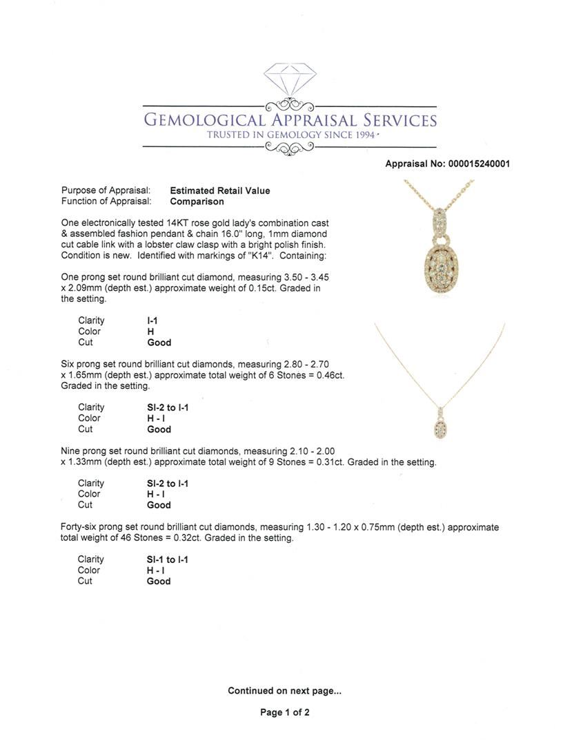One electronically tested 14KT rose gold lady's combination cast & assembled fashion pendant & chain 16.0" long, 1mm diamond cut cable link with a lobster claw clasp with a bright polish finish. Identified with markings of "K14". Condition is new. Containing: One prong set round brilliant cut diamond, measuring 3.50 - 3.45 x 2.09mm (depth est.) approximate weight of 0.15ct. Graded in the setting. Clarity: I-1. Color: Good Six prong set round brilliant cut diamonds, measuring 2.80 - 2.70 x 1.65mm (depth est.) approximate total weight of 6 Stones = 0.46ct. Graded in the setting. Clarity: SI-2 to I-1. Color: H - I. Cut Good Nine prong set round brilliant cut diamonds, measuring 2.10 - 2.00 x 1.33mm (depth est.) approximate total weight of 9 Stones = 0.31ct. Graded in the setting. Clarity: SI-2 to I-1. Color: H - I. Cut Good Forty-Six prong set round brilliant cut diamonds, measuring 1.30 - 1.20 x 0.75mm (depth est.) approximate total weight of 46 Stones = 0.32ct. Graded in the setting. Clarity: SI-1 to I-1. Color: H - I. Cut Good. Total Weight of Diamonds 1.24ct. Total Weight of Pendant & Chain 4.90gm. GAS Appraised at $3,630.00.