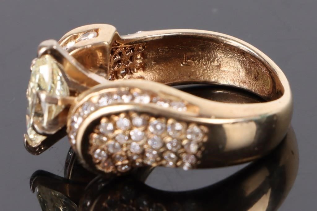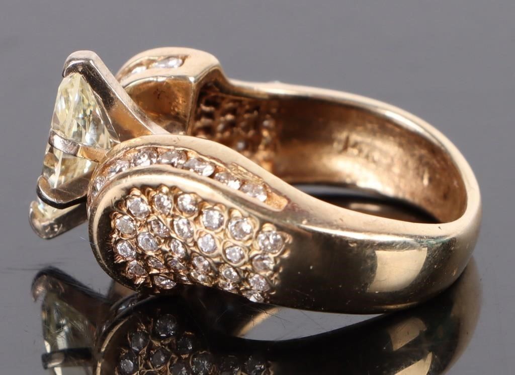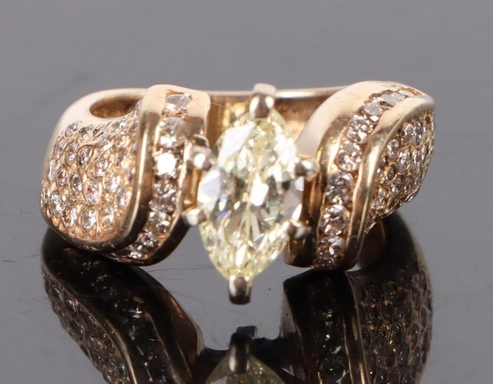 1.25 Ct. Marquis Center Diamond set in 14 karat Yellow Gold along with 72 melee Diamonds.