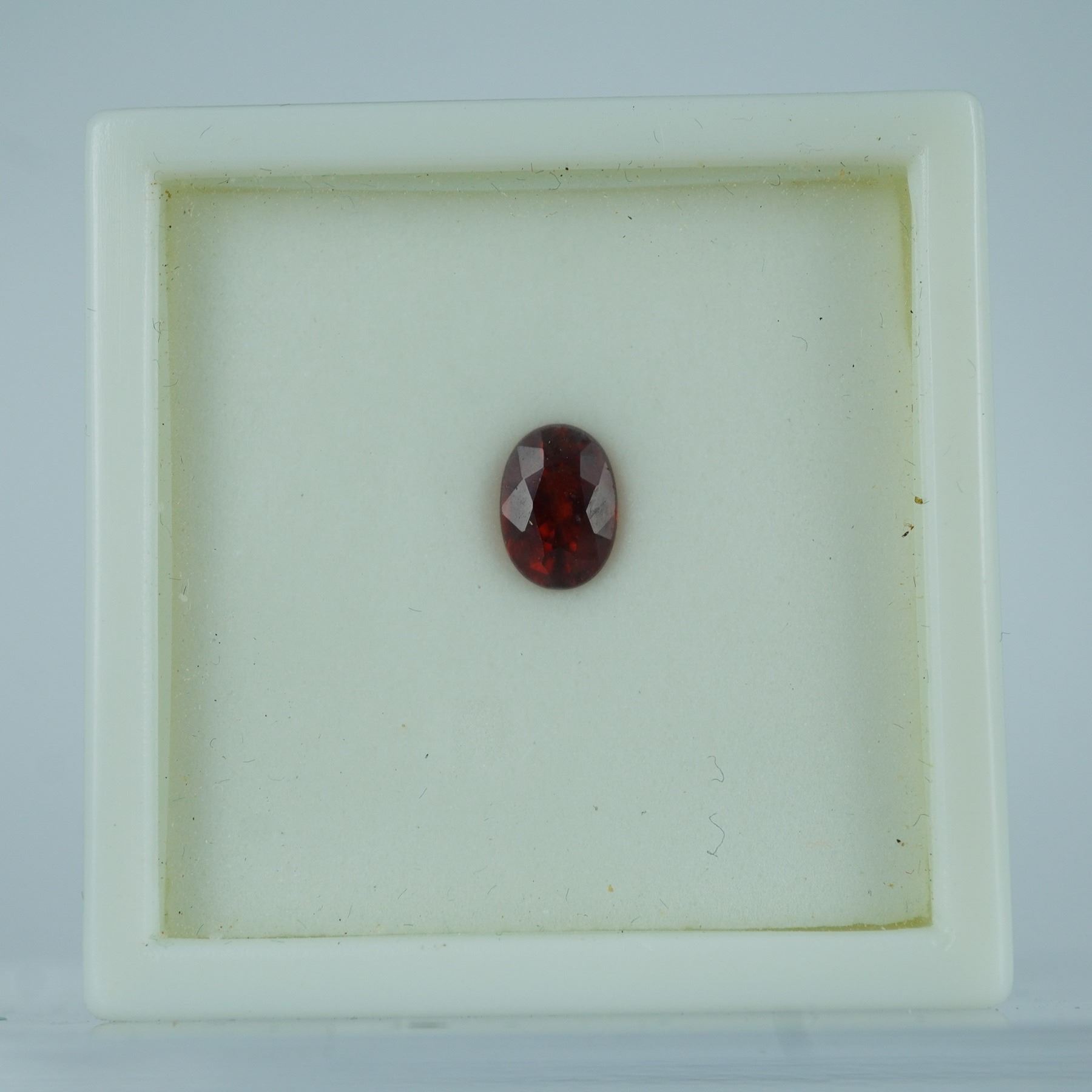 Spessartine garnet weighing approximately 1.25 carats, cut in an oval shape. Known for its rich, reddish-orange coloration, this gemstone offers vibrant saturation and strong brilliance. Garnets from the spessartine variety are favored in custom jewelry for their bold color and durability. Housed in a protective display case.
