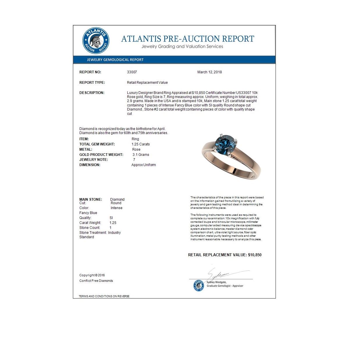 REF-147T8M -33007 ---- 1.25 CTW Certified Intense Blue SI Diamond Solitaire Engagement Ring 10K Rose Gold ---- Luxury Designer Brand Ring Appraised at $10,850 Certificate Number US33007 10k Rose gold, Ring Size is 7, Ring measuring approx. Uniform, weighing in total approx. 2.9 grams. Made in the USA and is stamped 10k, Main stone 1.25 carat total weight containing 1 pieces of Intense Fancy Blue color with SI quality Round shape cut Diamond , Stone #2 carat total weight containing pieces of color with quality shape cut