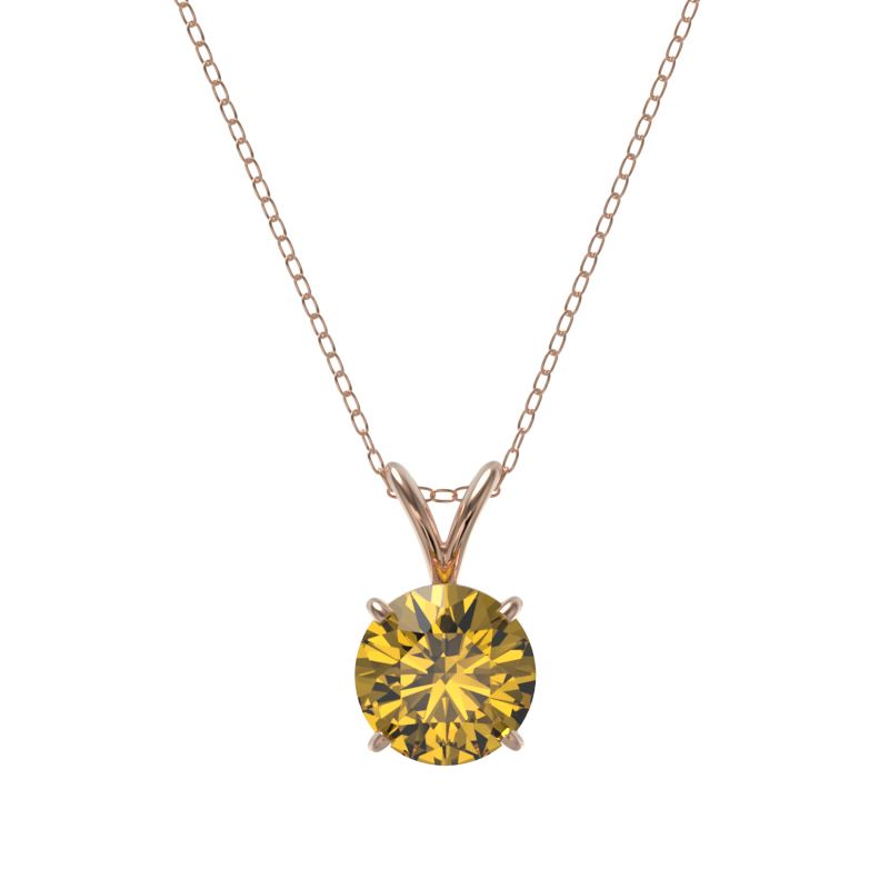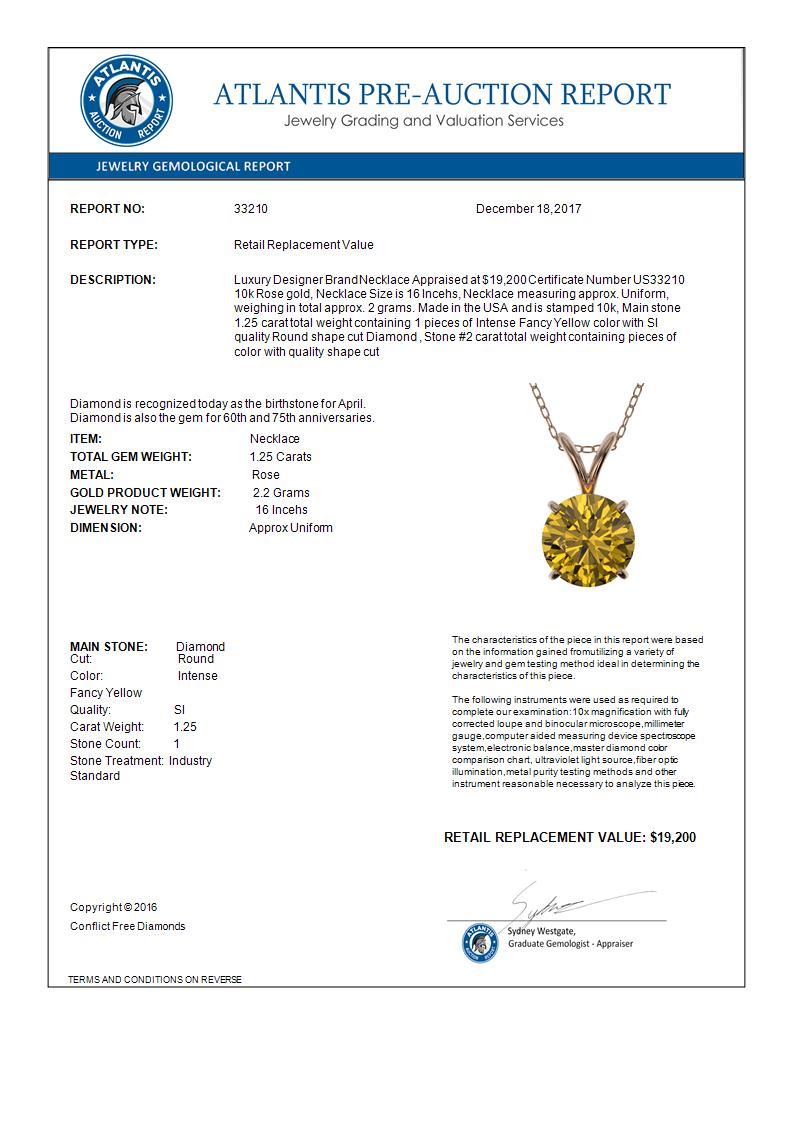 REF-240X2T -33210 ---- 1.25 CTW Certified Intense Yellow SI Diamond Solitaire Necklace 10K Rose Gold ---- Luxury Designer Brand Necklace Appraised at $19,200 Certificate Number US33210 10k Rose gold, Necklace Size is 16 Incehs, Necklace measuring approx. Uniform, weighing in total approx. 2 grams. Made in the USA and is stamped 10k, Main stone 1.25 carat total weight containing 1 pieces of Intense Fancy Yellow color with SI quality Round shape cut Diamond , Stone #2 carat total weight containing pieces of color with quality shape cut