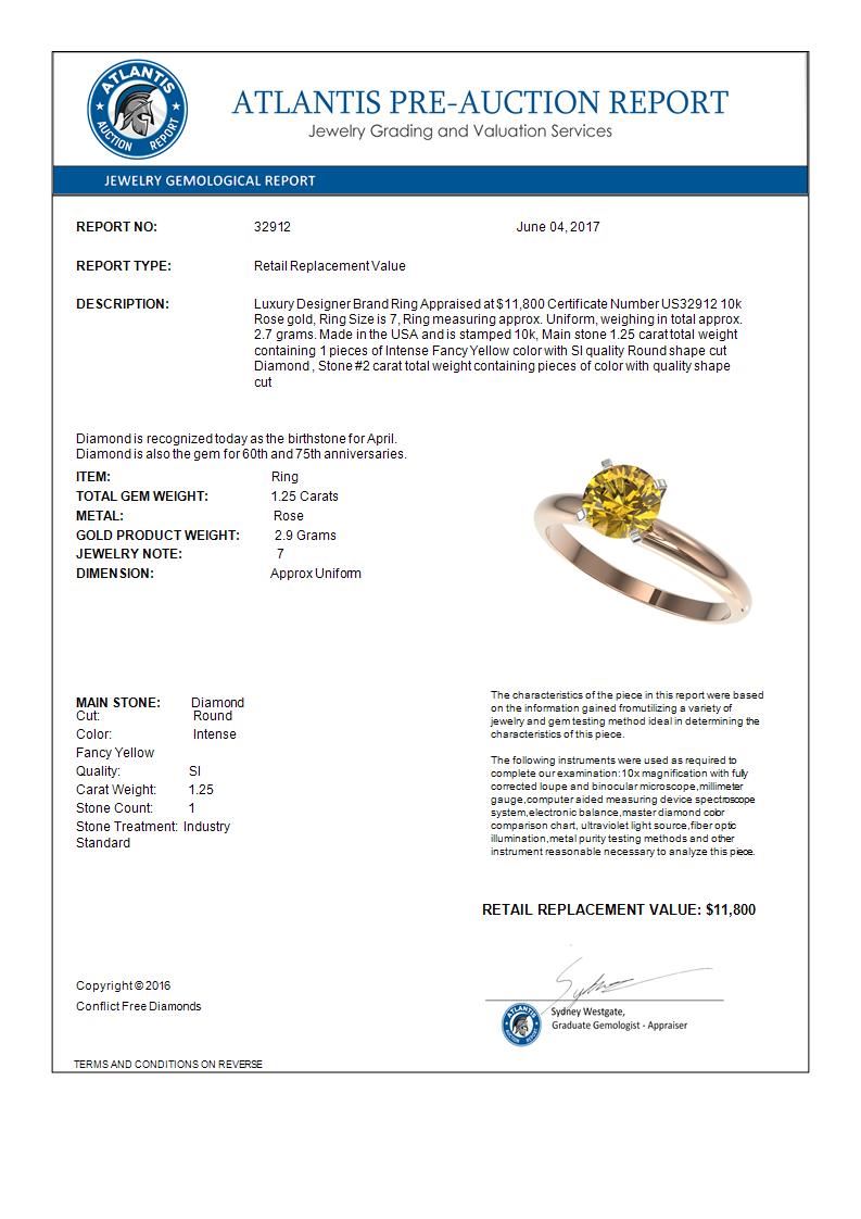 1.25 CTW Certified Intense Yellow SI Diamond Solitaire Ring 10K Rose Gold ---- Luxury Designer Brand Ring Appraised Retail Price at $11,800 ---- SKU Number US32912 10k Rose gold Ring Size is 7, Ring measuring approx. Uniform, weighing in total approx. 2.7 grams. Made in the USA and is stamped 10k, Main stone 1.25 carat total weight containing 1 pieces of Intense Fancy Yellow color with SI quality Round shape cut Diamond , Stone #2 carat total weight containing pieces of color with quality shape cut