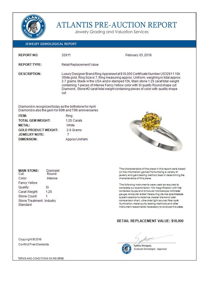 REF-272A8X -32911 ---- 1.25 CTW Certified Intense Yellow SI Diamond Solitaire Ring 10K White Gold ---- Luxury Designer Brand Ring Appraised at $18,000 Certificate Number US32911 10k White gold, Ring Size is 7, Ring measuring approx. Uniform, weighing in total approx. 2.7 grams. Made in the USA and is stamped 10k, Main stone 1.25 carat total weight containing 1 pieces of Intense Fancy Yellow color with SI quality Round shape cut Diamond , Stone #2 carat total weight containing pieces of color with quality shape cut