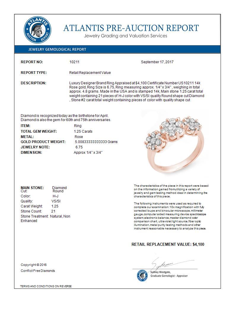 10211 - REF-92M7F ---- 1.25 CTW Certified VS/SI Diamond Ring 14K Rose Gold ---- Luxury Designer Brand Ring Appraised at $4,100 Certificate Number US10211 14k Rose gold, Ring Size is 6.75, Ring measuring approx. 1/4" x 3/4" , weighing in total approx. 4.8 grams. Made in the USA and is stamped 14k, Main stone 1.25 carat total weight containing 21 pieces of H-J color with VS/SI quality Round shape cut Diamond , Stone #2 carat total weight containing pieces of color with quality shape cut