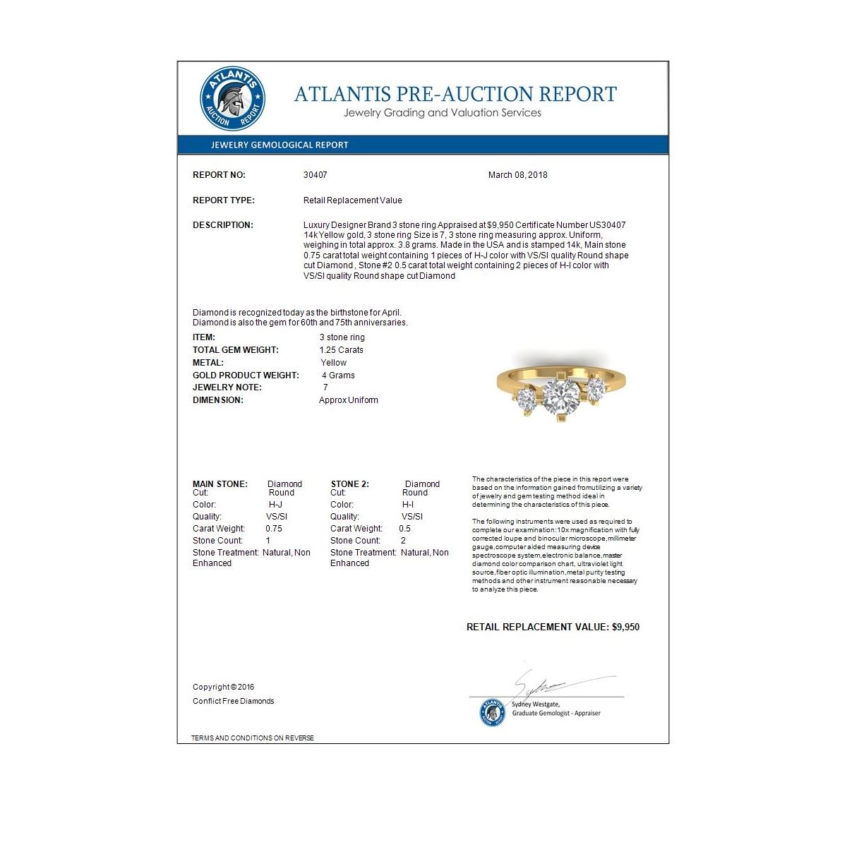 REF-201X3T -30407 ---- 1.25 CTW Certified VS/SI Diamond Solitaire 3 Stone Ring 14K Yellow Gold ---- Luxury Designer Brand 3 stone ring Appraised at $9,950 Certificate Number US30407 14k Yellow gold, 3 stone ring Size is 7, 3 stone ring measuring approx. Uniform, weighing in total approx. 3.8 grams. Made in the USA and is stamped 14k, Main stone 0.75 carat total weight containing 1 pieces of H-J color with VS/SI quality Round shape cut Diamond , Stone #2 0.5 carat total weight containing 2 pieces of H-I color with VS/SI quality Round shape cut Diamond