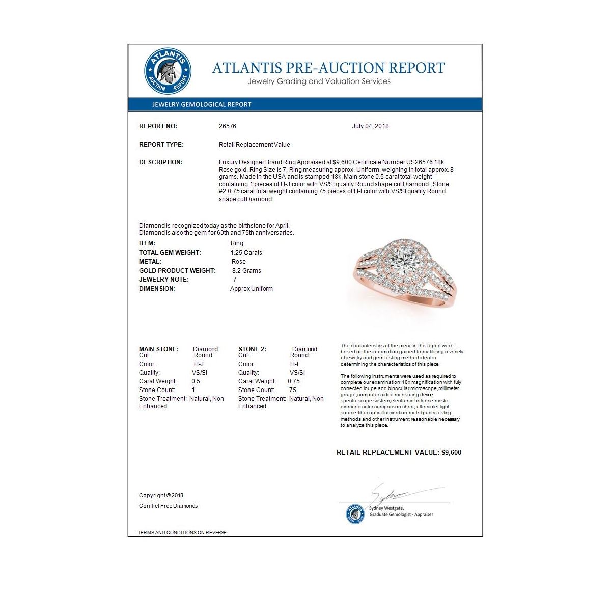 REF-174X5T -26576 ---- 1.25 CTW Certified VS/SI Diamond Solitaire Halo Ring 18K Rose Gold ---- Luxury Designer Brand Ring Appraised at $9,600 Certificate Number US26576 18k Rose gold, Ring Size is 7, Ring measuring approx. Uniform, weighing in total approx. 8 grams. Made in the USA and is stamped 18k, Main stone 0.5 carat total weight containing 1 pieces of H-J color with VS/SI quality Round shape cut Diamond , Stone #2 0.75 carat total weight containing 75 pieces of H-I color with VS/SI quality Round shape cut Diamond