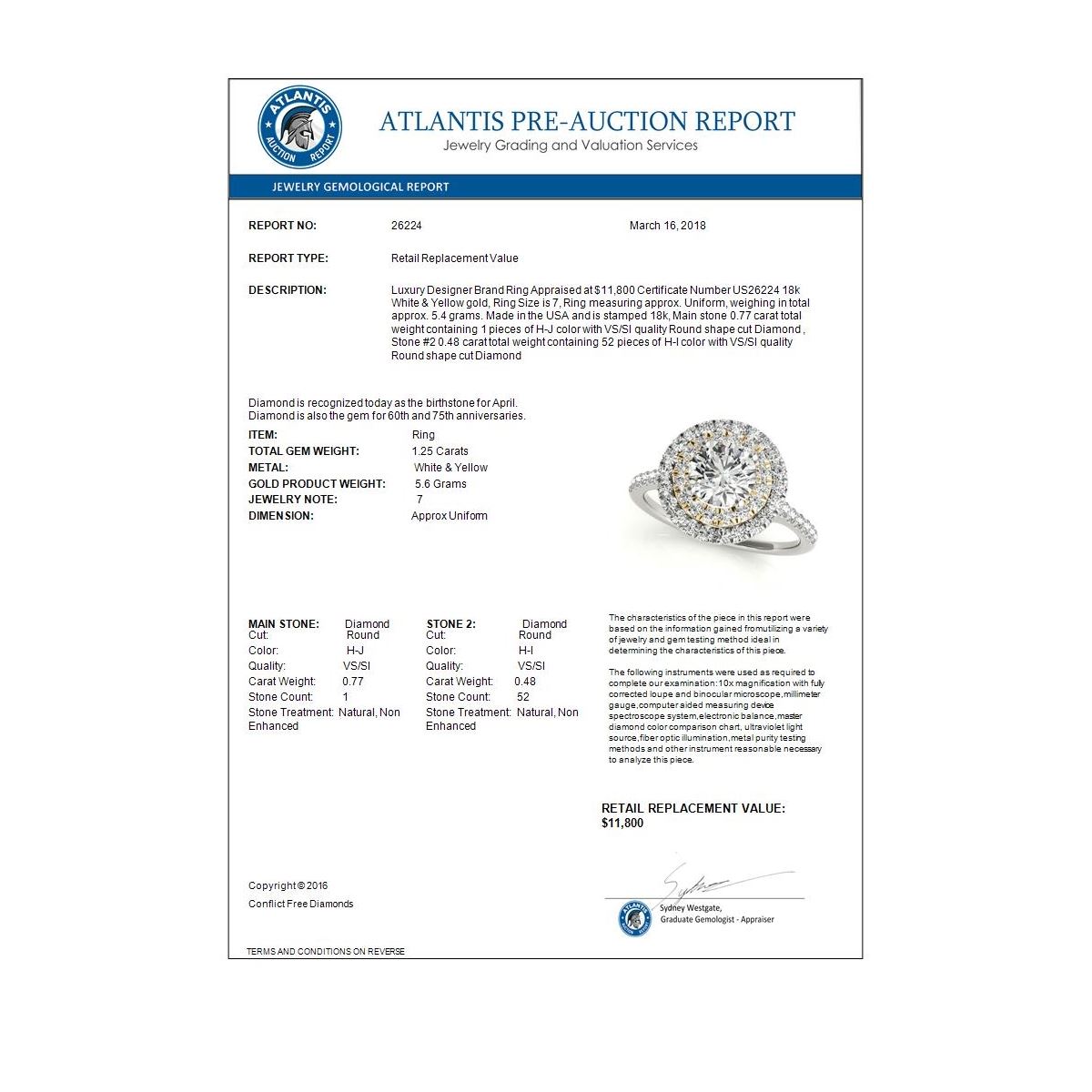 REF-214W9F -26224 ---- 1.25 CTW Certified VS/SI Diamond Solitaire Halo Ring 18K White & Yellow Gold ---- Luxury Designer Brand Ring Appraised at $11,800 Certificate Number US26224 18k White & Yellow gold, Ring Size is 7, Ring measuring approx. Uniform, weighing in total approx. 5.4 grams. Made in the USA and is stamped 18k, Main stone 0.77 carat total weight containing 1 pieces of H-J color with VS/SI quality Round shape cut Diamond , Stone #2 0.48 carat total weight containing 52 pieces of H-I color with VS/SI quality Round shape cut Diamond