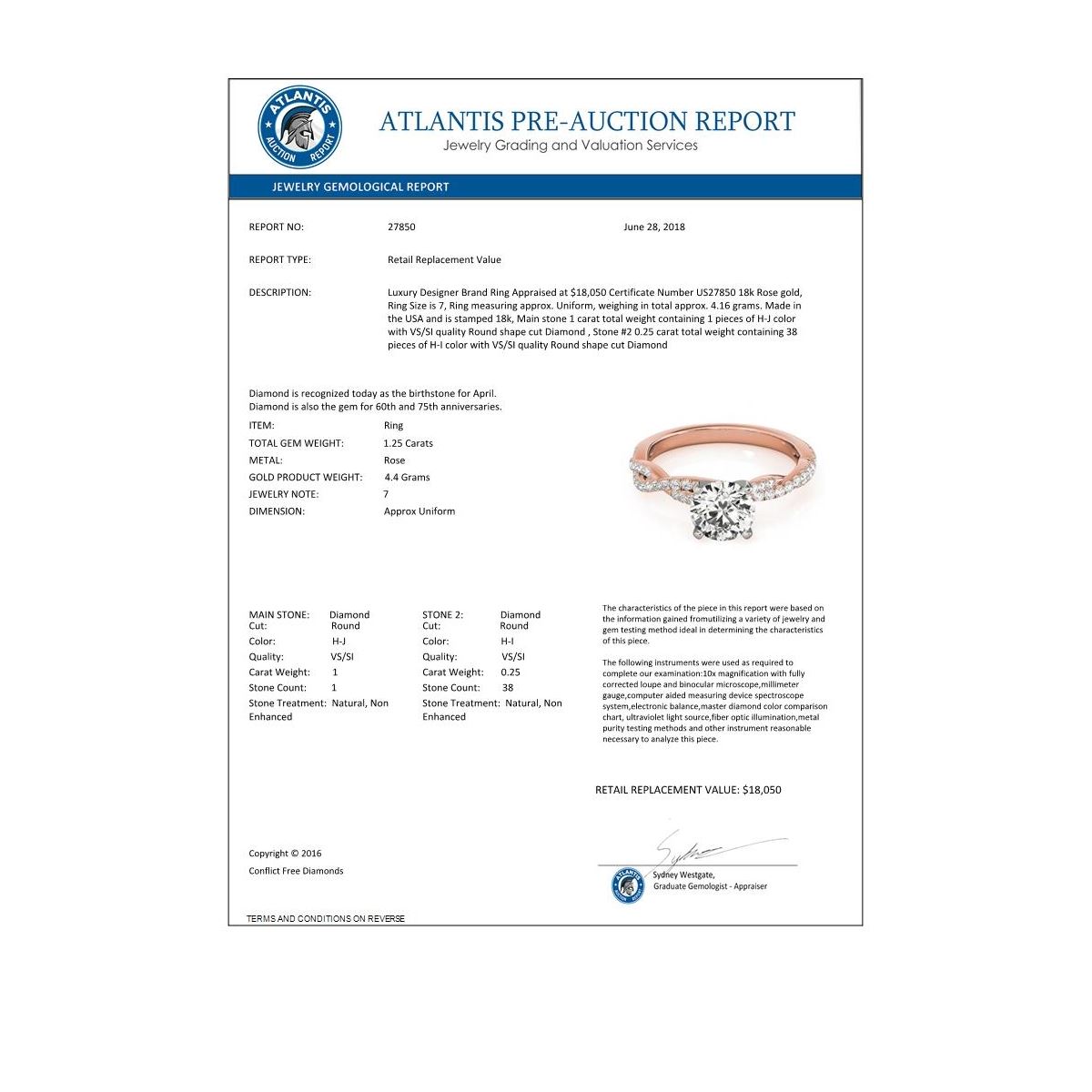 REF-364F2N -27850 ---- 1.25 CTW Certified VS/SI Diamond Solitaire Ring 18K Rose Gold ---- Luxury Designer Brand Ring Appraised at $18,050 Certificate Number US27850 18k Rose gold, Ring Size is 7, Ring measuring approx. Uniform, weighing in total approx. 4.16 grams. Made in the USA and is stamped 18k, Main stone 1 carat total weight containing 1 pieces of H-J color with VS/SI quality Round shape cut Diamond , Stone #2 0.25 carat total weight containing 38 pieces of H-I color with VS/SI quality Round shape cut Diamond