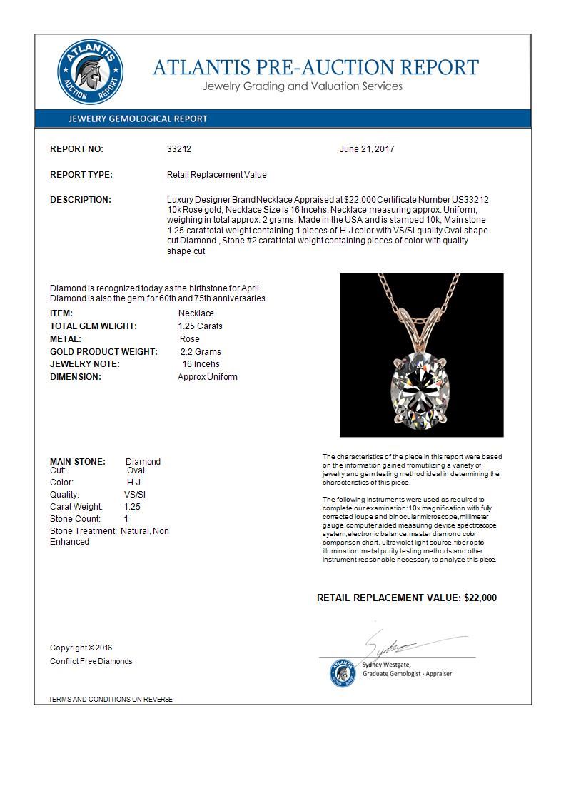 1.25 CTW Certified VS/SI Quality Oval Diamond Solitaire Necklace 10K Rose Gold ---- Luxury Designer Brand Necklace Appraised Retail Price at $22,000 ---- SKU Number US33212 10k Rose gold Necklace Size is 16 Incehs, Necklace measuring approx. Uniform, weighing in total approx. 2 grams. Made in the USA and is stamped 10k, Main stone 1.25 carat total weight containing 1 pieces of H-J color with VS/SI quality Oval shape cut Diamond , Stone #2 carat total weight containing pieces of color with quality shape cut