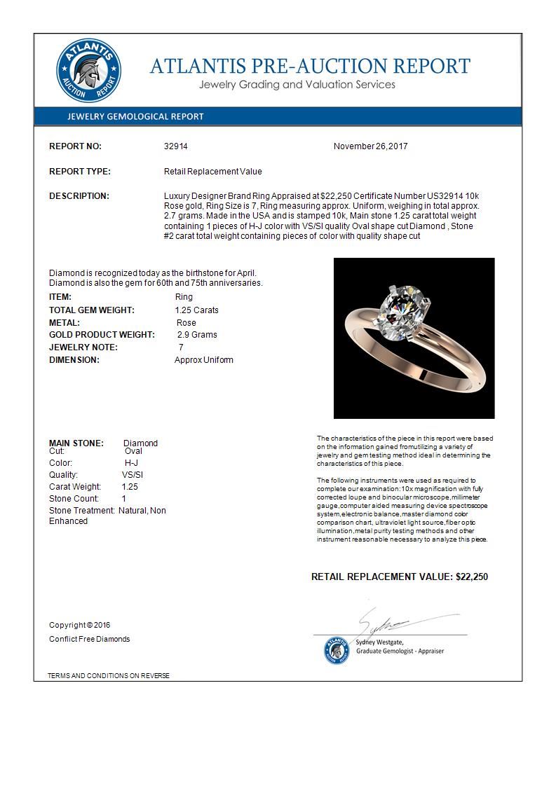 REF-370W8F -32914 ---- 1.25 CTW Certified VS/SI Quality Oval Diamond Solitaire Ring 10K Rose Gold ---- Luxury Designer Brand Ring Appraised at $22,250 Certificate Number US32914 10k Rose gold, Ring Size is 7, Ring measuring approx. Uniform, weighing in total approx. 2.7 grams. Made in the USA and is stamped 10k, Main stone 1.25 carat total weight containing 1 pieces of H-J color with VS/SI quality Oval shape cut Diamond , Stone #2 carat total weight containing pieces of color with quality shape cut