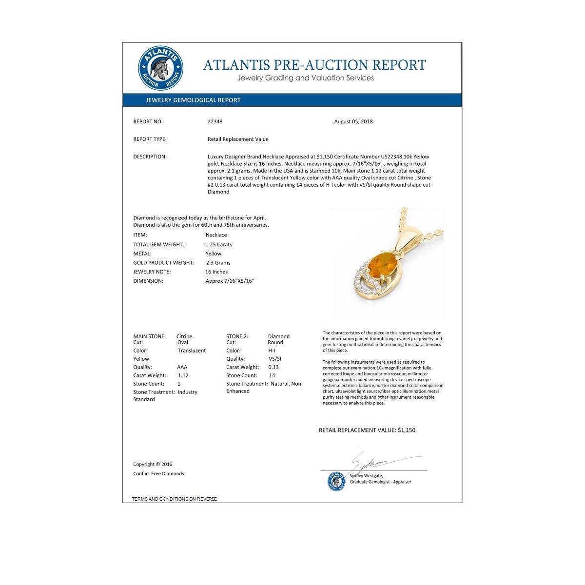 REF-18H9A -22348 ---- 1.25 CTW Citrine & Micro Pave VS/SI Diamond Necklace 10K Yellow Gold ---- Luxury Designer Brand Necklace Appraised at $1,150 Certificate Number US22348 10k Yellow gold, Necklace Size is 16 Inches, Necklace measuring approx. 7/16"X5/16" , weighing in total approx. 2.1 grams. Made in the USA and is stamped 10k, Main stone 1.12 carat total weight containing 1 pieces of Translucent Yellow color with AAA quality Oval shape cut Citrine , Stone #2 0.13 carat total weight containing 14 pieces of H-I color with VS/SI quality Round shape cut Diamond
