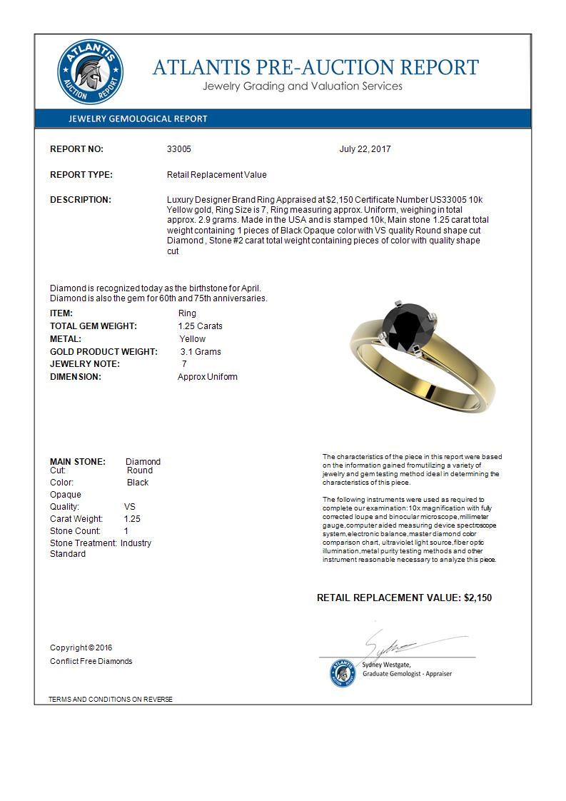 1.25 CTW Fancy Black VS Diamond Solitaire Engagement Ring 10K Yellow Gold ---- Luxury Designer Brand Ring Appraised Retail Price at $2,150 ---- SKU Number US33005 10k Yellow gold Ring Size is 7, Ring measuring approx. Uniform, weighing in total approx. 2.9 grams. Made in the USA and is stamped 10k, Main stone 1.25 carat total weight containing 1 pieces of Black Opaque color with VS quality Round shape cut Diamond , Stone #2 carat total weight containing pieces of color with quality shape cut