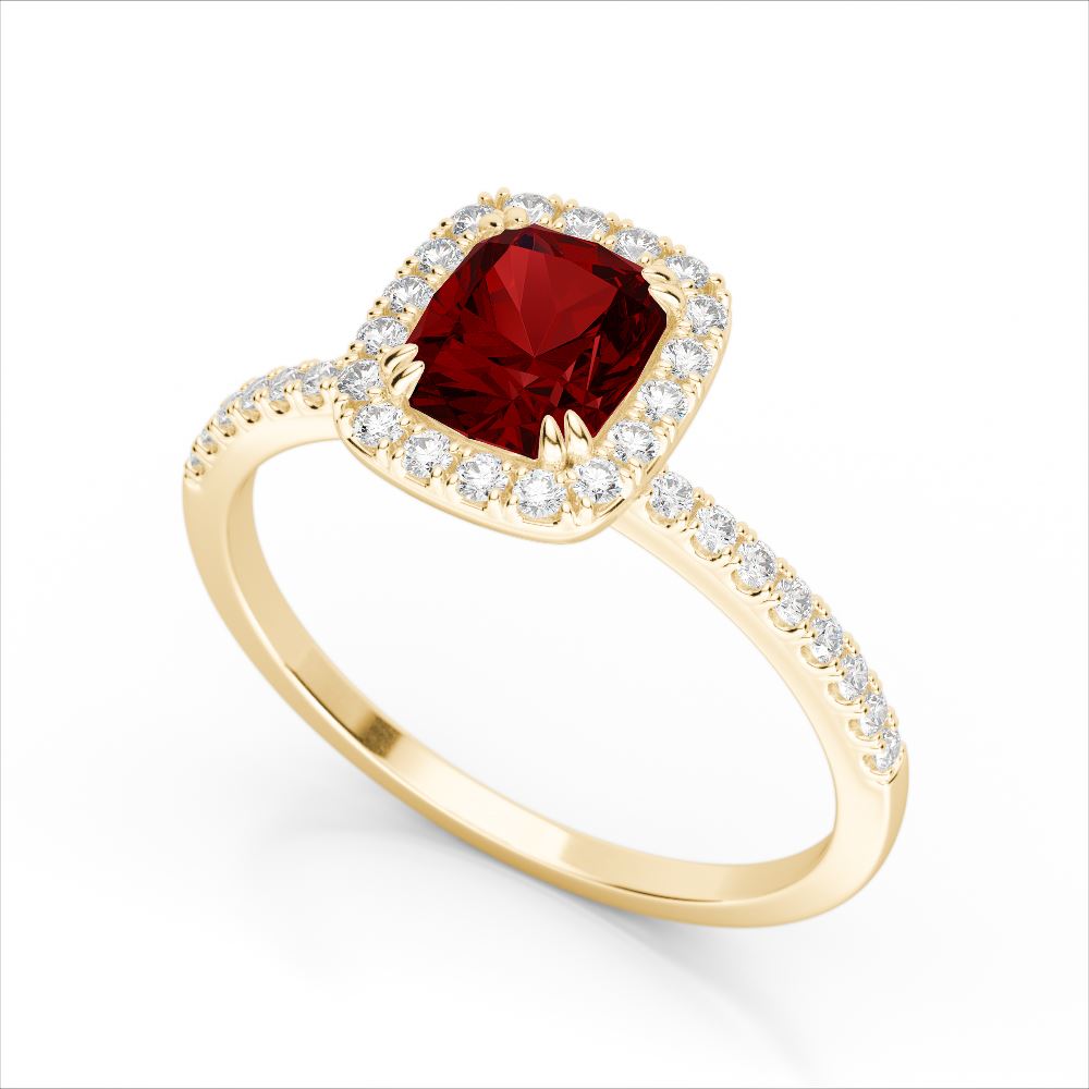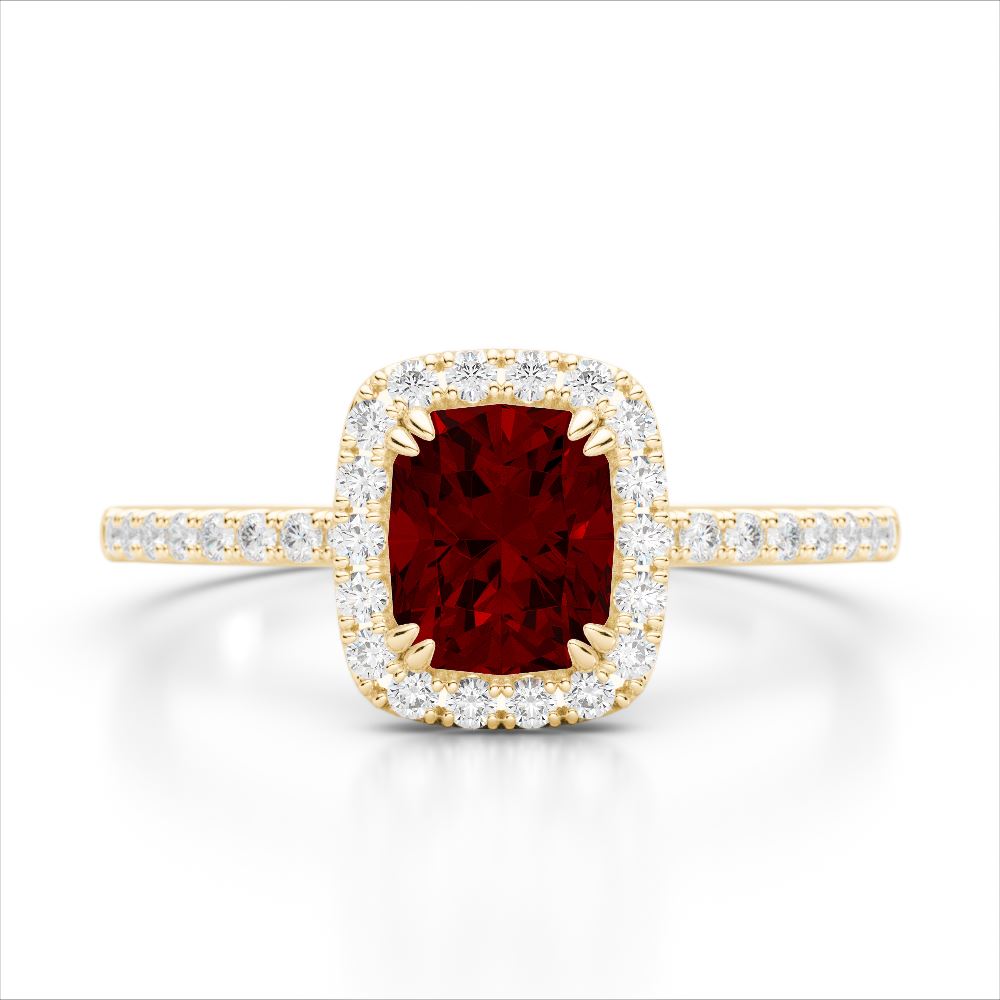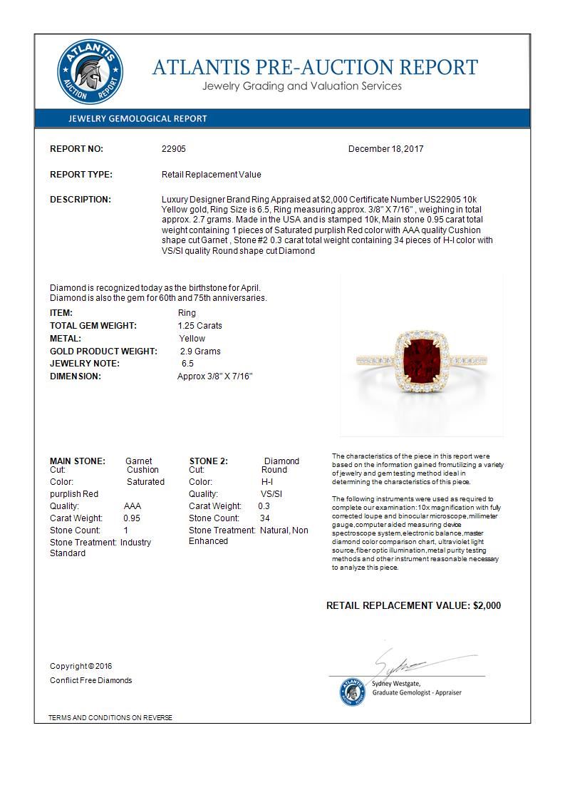 REF-33W3F -22905 ---- 1.25 CTW Garnet & Micro Pave VS/SI Diamond Halo Ring 10K Yellow Gold ---- Luxury Designer Brand Ring Appraised at $2,000 Certificate Number US22905 10k Yellow gold, Ring Size is 6.5, Ring measuring approx. 3/8" X 7/16" , weighing in total approx. 2.7 grams. Made in the USA and is stamped 10k, Main stone 0.95 carat total weight containing 1 pieces of Saturated purplish Red color with AAA quality Cushion shape cut Garnet , Stone #2 0.3 carat total weight containing 34 pieces of H-I color with VS/SI quality Round shape cut Diamond
