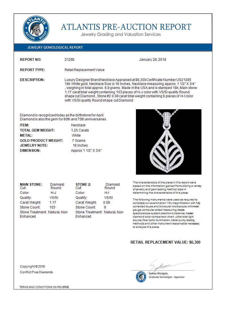REF-114A8X -21285 ---- 1.25 CTW Micro Pave VS/SI Diamond Necklace Designer 18K White Gold ---- Luxury Designer Brand Necklace Appraised at $6,300 Certificate Number US21285 18k White gold, Necklace Size is 16 Inches, Necklace measuring approx. 1 1/2" X 3/4" , weighing in total approx. 6.8 grams. Made in the USA and is stamped 18k, Main stone 1.17 carat total weight containing 103 pieces of H-J color with VS/SI quality Round shape cut Diamond , Stone #2 0.08 carat total weight containing 9 pieces of H-I color with VS/SI quality Round shape cut Diamond