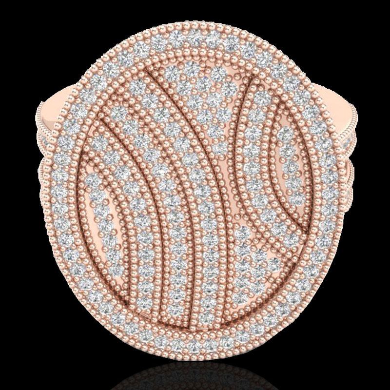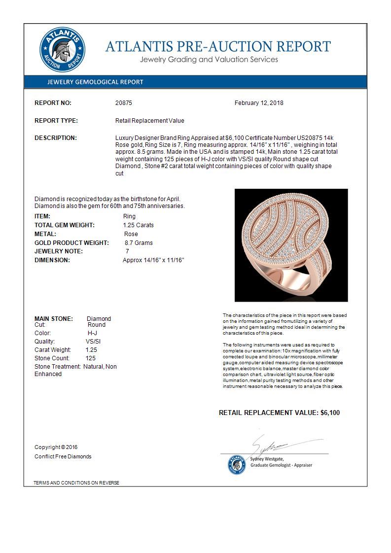 REF-111Y3K -20875 ---- 1.25 CTW Micro Pave VS/SI Diamond Ring 14K Rose Gold ---- Luxury Designer Brand Ring Appraised at $6,100 Certificate Number US20875 14k Rose gold, Ring Size is 7, Ring measuring approx. 14/16" x 11/16" , weighing in total approx. 8.5 grams. Made in the USA and is stamped 14k, Main stone 1.25 carat total weight containing 125 pieces of H-J color with VS/SI quality Round shape cut Diamond , Stone #2 carat total weight containing pieces of color with quality shape cut