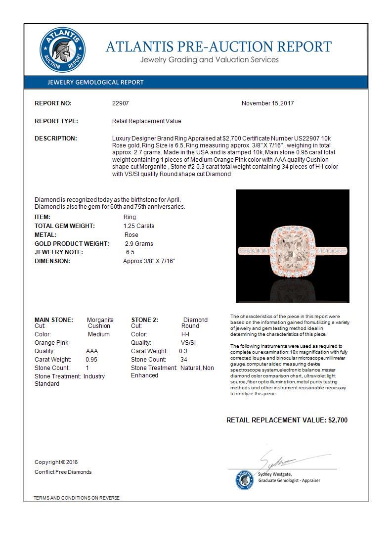 REF-40W9F -22907 ---- 1.25 CTW Morganite & Micro Pave VS/SI Diamond Halo Ring 10K Rose Gold ---- Luxury Designer Brand Ring Appraised at $2,700 Certificate Number US22907 10k Rose gold, Ring Size is 6.5, Ring measuring approx. 3/8" X 7/16" , weighing in total approx. 2.7 grams. Made in the USA and is stamped 10k, Main stone 0.95 carat total weight containing 1 pieces of Medium Orange Pink color with AAA quality Cushion shape cut Morganite , Stone #2 0.3 carat total weight containing 34 pieces of H-I color with VS/SI quality Round shape cut Diamond