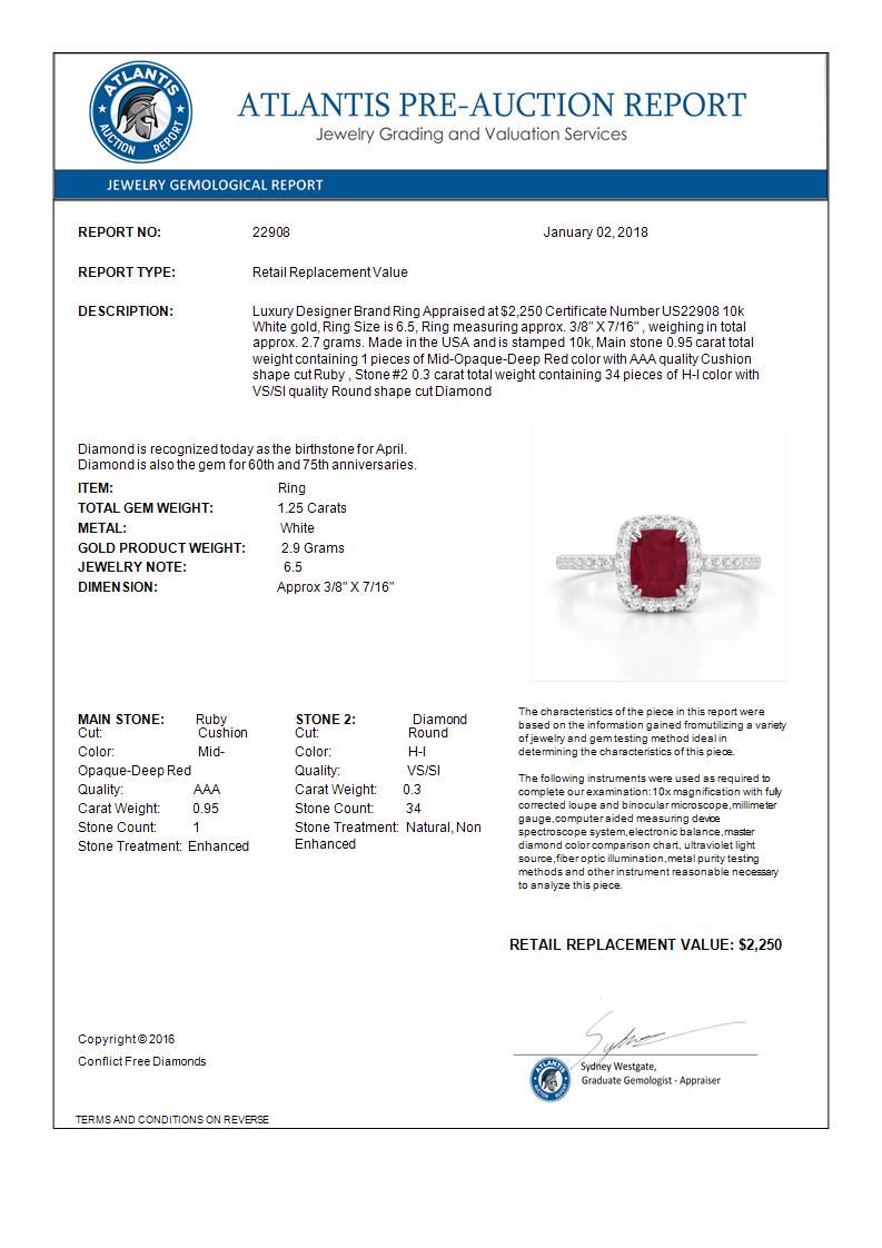 REF-34T2M -22908 ---- 1.25 CTW Ruby & Micro Pave VS/SI Diamond Halo Ring 10K White Gold ---- Luxury Designer Brand Ring Appraised at $2,250 Certificate Number US22908 10k White gold, Ring Size is 6.5, Ring measuring approx. 3/8" X 7/16" , weighing in total approx. 2.7 grams. Made in the USA and is stamped 10k, Main stone 0.95 carat total weight containing 1 pieces of Mid-Opaque-Deep Red color with AAA quality Cushion shape cut Ruby , Stone #2 0.3 carat total weight containing 34 pieces of H-I color with VS/SI quality Round shape cut Diamond