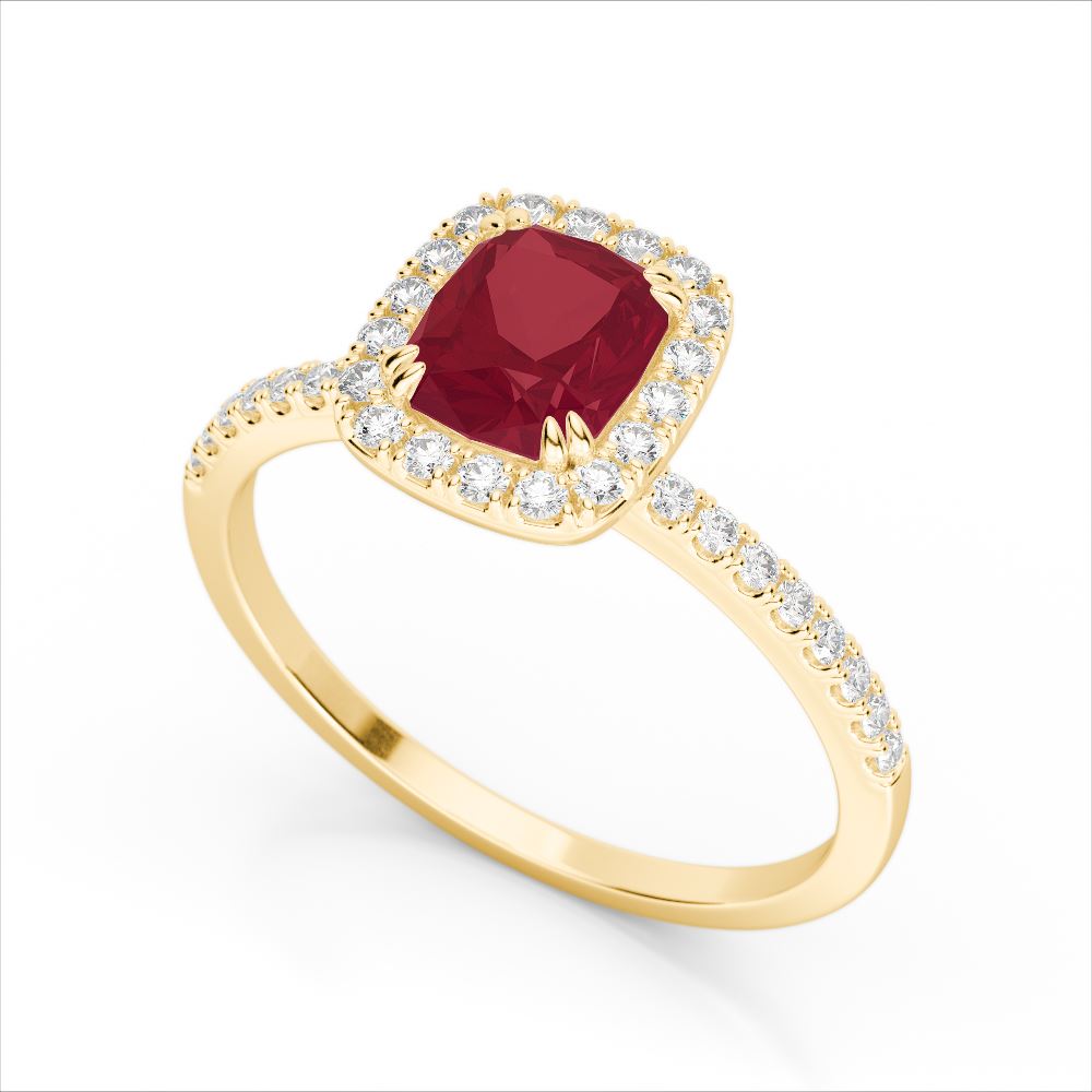 REF-34Y2K -22909 ---- 1.25 CTW Ruby & Micro Pave VS/SI Diamond Halo Ring 10K Yellow Gold ---- Luxury Designer Brand Ring Appraised at $2,250 Certificate Number US22909 10k Yellow gold, Ring Size is 6.5, Ring measuring approx. 3/8" X 7/16" , weighing in total approx. 2.7 grams. Made in the USA and is stamped 10k, Main stone 0.95 carat total weight containing 1 pieces of Mid-Opaque-Deep Red color with AAA quality Cushion shape cut Ruby , Stone #2 0.3 carat total weight containing 34 pieces of H-I color with VS/SI quality Round shape cut Diamond