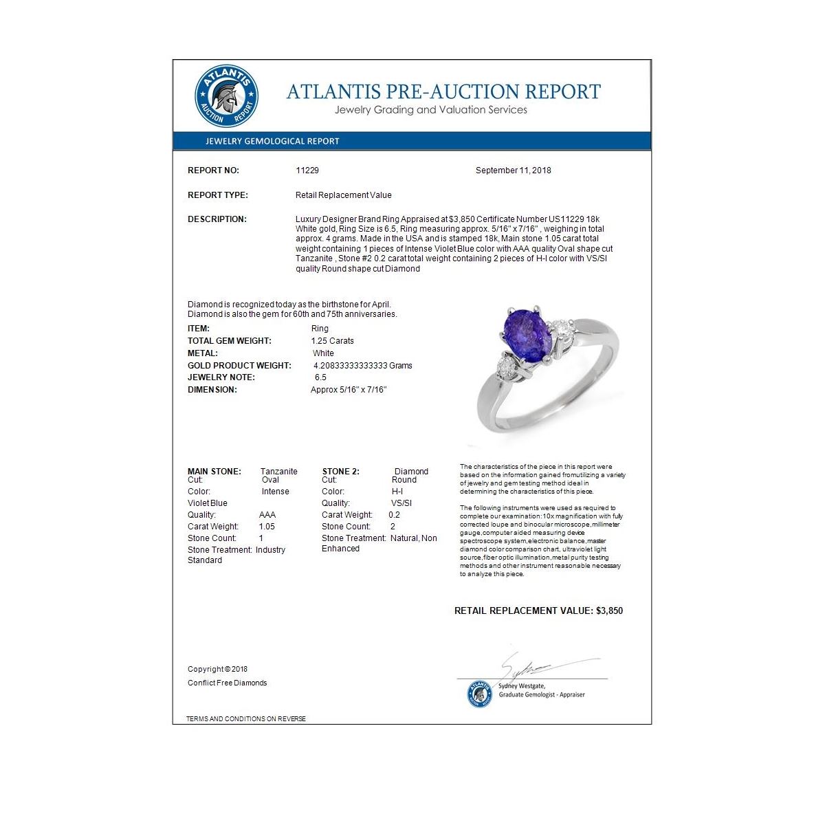 REF-53A8X -11229 ---- 1.25 CTW Tanzanite & Diamond Ring 18K White Gold ---- Luxury Designer Brand Ring Appraised at $3,850 Certificate Number US11229 18k White gold, Ring Size is 6.5, Ring measuring approx. 5/16" x 7/16" , weighing in total approx. 4 grams. Made in the USA and is stamped 18k, Main stone 1.05 carat total weight containing 1 pieces of Intense Violet Blue color with AAA quality Oval shape cut Tanzanite , Stone #2 0.2 carat total weight containing 2 pieces of H-I color with VS/SI quality Round shape cut Diamond