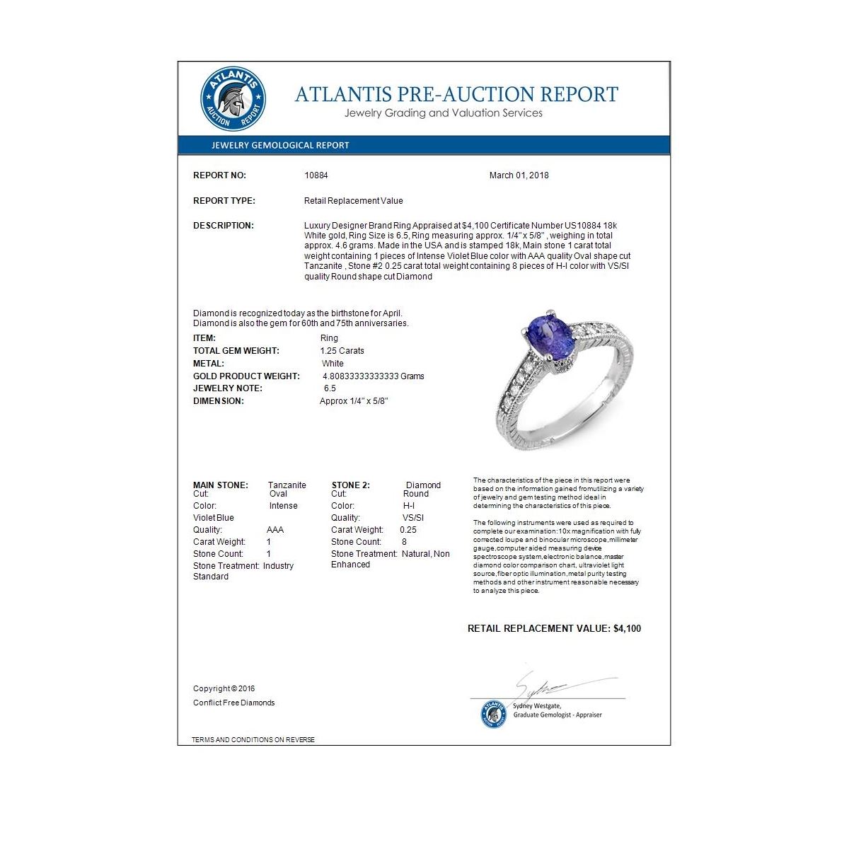 REF-57W3F -10884 ---- 1.25 CTW Tanzanite & Diamond Ring 18K White Gold ---- Luxury Designer Brand Ring Appraised at $4,100 Certificate Number US10884 18k White gold, Ring Size is 6.5, Ring measuring approx. 1/4" x 5/8" , weighing in total approx. 4.6 grams. Made in the USA and is stamped 18k, Main stone 1 carat total weight containing 1 pieces of Intense Violet Blue color with AAA quality Oval shape cut Tanzanite , Stone #2 0.25 carat total weight containing 8 pieces of H-I color with VS/SI quality Round shape cut Diamond