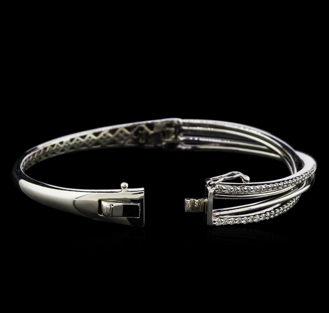 One electronically tested 14KT white gold lady's combination cast & assembled fashion crossover bangle bracelet with a tongue clasp with foldover safety with a bright polish finish. The featured lady's bangle bracelet measures approximately 7 inches in length. Identified with markings of "K14". Condition is new, good workmanship. Containing: One Hundred Eight prong set round brilliant cut diamonds, measuring 1.50 - 1.40 x 0.90mm (depth est.) approximate total weight of 108 Stones = 1.25ct. Graded in the setting. Clarity: SI-1 to I-1. Color: H - I. Cut Good. Total Weight of Diamonds 1.25ct. Total Weight of Bangle Bracelet 20.50gm. GAS Appraised at $7,120.00.