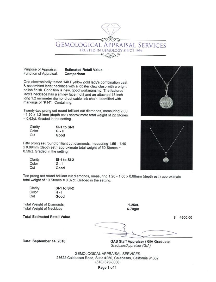 One electronically tested 14KT yellow gold lady's combination cast & assembled lariat necklace with a lobster claw clasp with a bright polish finish. The featured lady's necklace has a smiley face motif and an attached 18 inch long 1.2 millimeter diamond cut cable link chain. Identified with markings of 'K14'. Condition is new, good workmanship. Containing: Twenty-Two prong set round brilliant cut diamonds, measuring 2.00 - 1.90 x 1.21mm (depth est.) approximate total weight of 22 Stones = 0.62ct. Graded in the setting. Clarity SI-1 to SI-3. Color: G - H Cut Good Fifty prong set round brilliant cut diamonds, measuring 1.55 - 1.40 x 0.89mm (depth est.) approximate total weight of 50 Stones = 0.56ct. Graded in the setting. Clarity SI-1 to SI-2. Color: G - I Cut Good Ten prong set round brilliant cut diamonds, measuring 1.20 - 1.00 x 0.68mm (depth est.) approximate total weight of 10 Stones = 0.07ct. Graded in the setting. Clarity SI-1 to SI-2. Color: H - I Cut Good. Total Weight of Diamonds 1.25ct.. Total Weight of Necklace 6.70gm GAS Appraised at $4,500.00.