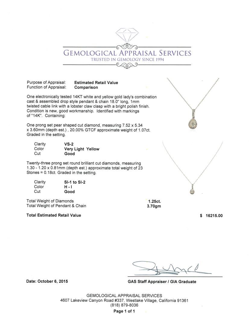 One electronically tested 14KT white and yellow gold lady's combination cast & assembled drop style pendant & chain 18.0" long, 1mm twisted cable link with a lobster claw clasp with a bright polish finish. Identified with markings of "14K". Condition is new, good workmanship. Containing: One prong set pear shaped cut diamond, measuring 7.52 x 5.34 x 3.60mm (depth est.) , 20.00.%. GTCF approximate weight of 1.07ct. Graded in the setting. Clarity: VS-2 Cut Good Twenty-Three prong set round brilliant cut diamonds, measuring 1.30 - 1.20 x 0.81mm (depth est.) approximate total weight of 23 Stones = 0.18ct. Graded in the setting. Clarity: SI-1 to SI-2. Color: H - I. Cut Good. Total Weight of Diamonds 1.25ct. Total Weight of Pendant & Chain 3.70gm. GAS Appraised at $16,215.00.