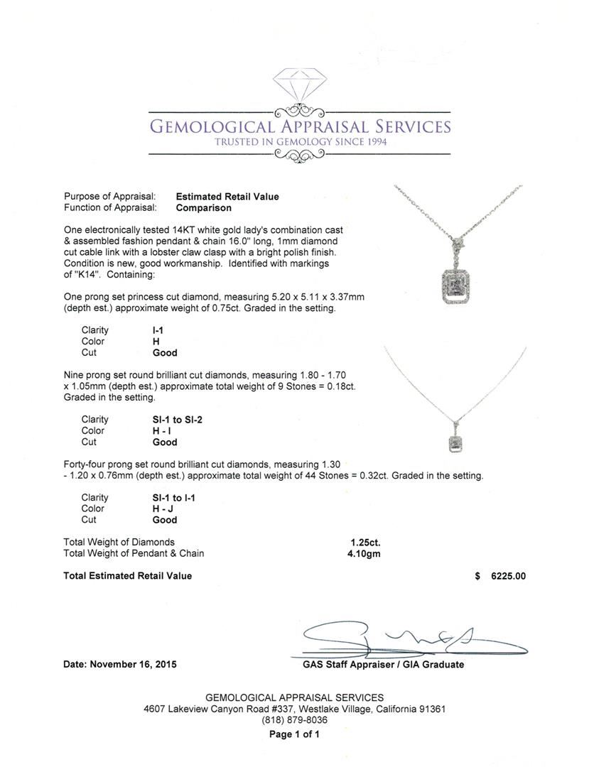 One electronically tested 14KT white gold lady's combination cast & assembled fashion pendant & chain 16.0" long, 1mm diamond cut cable link with a lobster claw clasp with a bright polish finish. Identified with markings of "K14". Condition is new, good workmanship. Containing: One prong set princess cut diamond, measuring 5.20 x 5.11 x 3.37mm (depth est.) approximate weight of 0.75ct. Graded in the setting. Clarity: I-1. Color: Good Nine prong set round brilliant cut diamonds, measuring 1.80 - 1.70 x 1.05mm (depth est.) approximate total weight of 9 Stones = 0.18ct. Graded in the setting. Clarity: SI-1 to SI-2. Color: H - I. Cut Good Forty-Four prong set round brilliant cut diamonds, measuring 1.30 - 1.20 x 0.76mm (depth est.) approximate total weight of 44 Stones = 0.32ct. Graded in the setting. Clarity: SI-1 to I-1. Color: H - J. Cut Good. Total Weight of Diamonds 1.25ct. Total Weight of Pendant & Chain 4.10gm. GAS Appraised at $6,225.00.