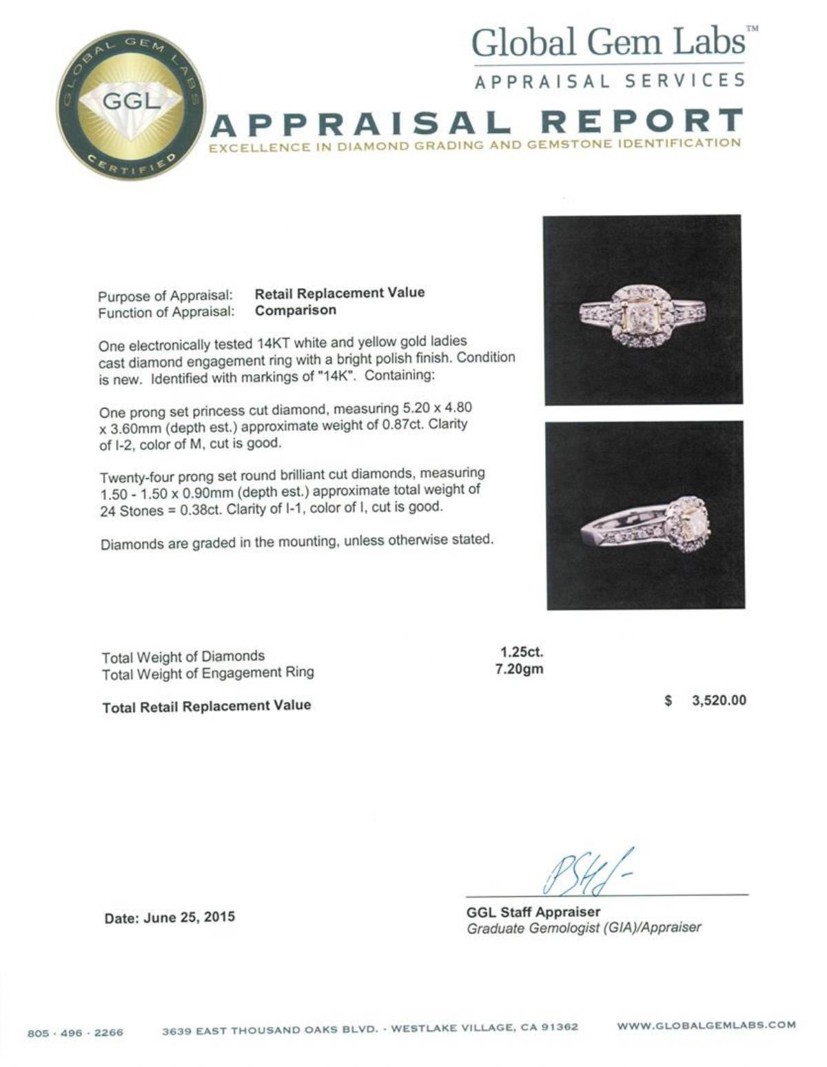 One electronically tested 14KT white and yellow gold ladies cast diamond engagement ring with a bright polish finish. Identified with markings of "14K". Condition is new. Containing: One prong set princess cut diamond, measuring 5.20 x 4.80 x 3.60mm (depth est.) approximate weight of 0.87ct. Clarity: I-2. Color: M, Cut is Good. Twenty-Four prong set round brilliant cut diamonds, measuring 1.50 - 1.50 x 0.90mm (depth est.) approximate total weight of 24 Stones = 0.38ct. Clarity: I-1. Color: I, Cut is Good. Diamonds are graded in the mounting, unless otherwise stated. Total Weight of Diamonds 1.25ct. Total Weight of Engagement Ring 7.20 grams. GGL Appraised.