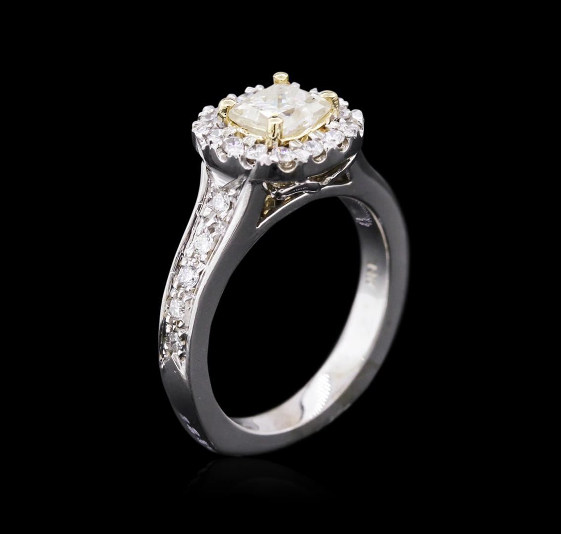 One electronically tested 14KT white and yellow gold ladies cast diamond engagement ring with a bright polish finish. Identified with markings of "14K". Condition is new. Containing: One prong set princess cut diamond, measuring 5.20 x 4.80 x 3.60mm (depth est.) approximate weight of 0.87ct. Clarity: I-2. Color: M, Cut is Good. Twenty-Four prong set round brilliant cut diamonds, measuring 1.50 - 1.50 x 0.90mm (depth est.) approximate total weight of 24 Stones = 0.38ct. Clarity: I-1. Color: I, Cut is Good. Diamonds are graded in the mounting, unless otherwise stated. Total Weight of Diamonds 1.25ct. Total Weight of Engagement Ring 7.20 grams. GGL Appraised.