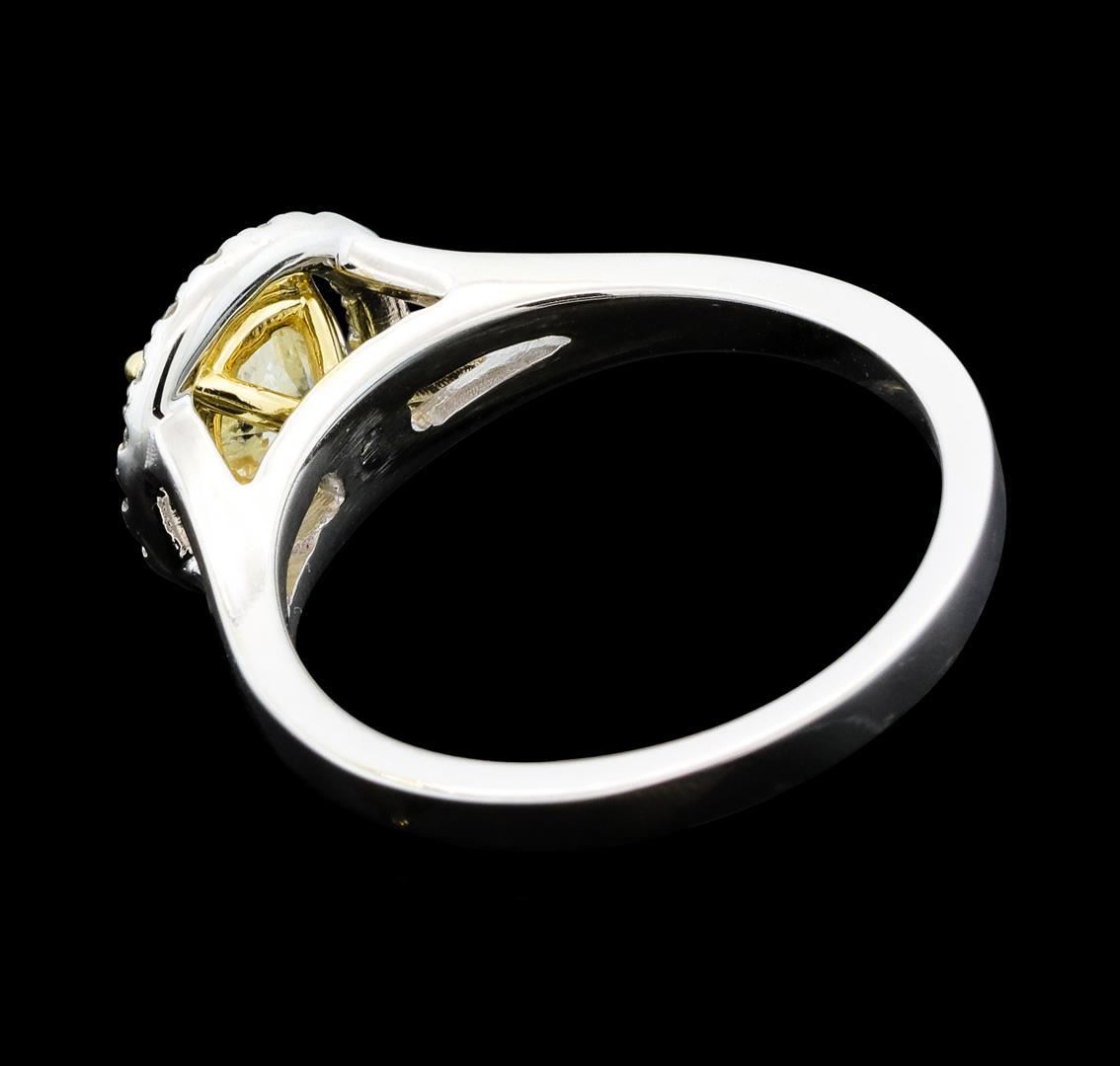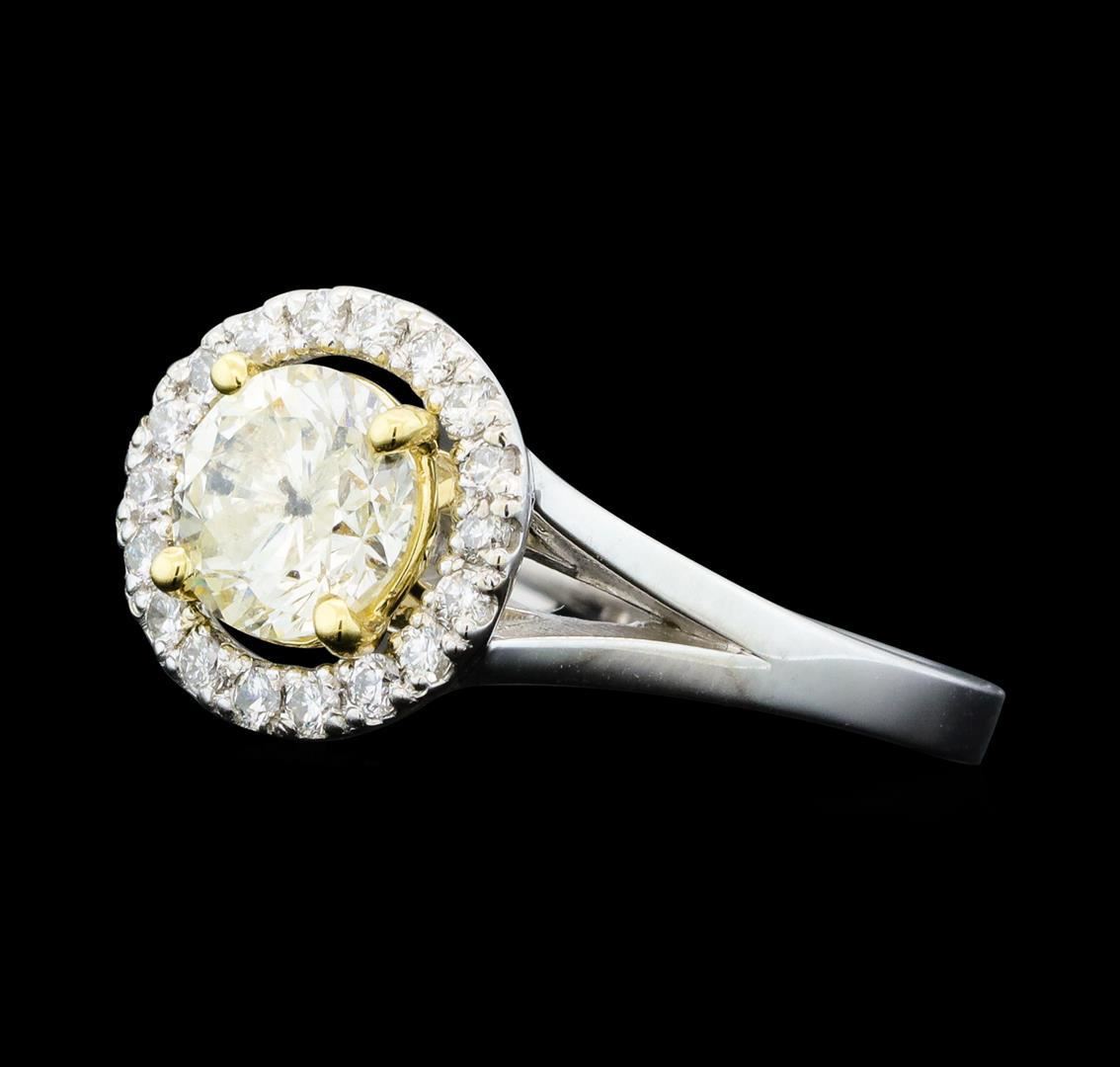 One electronically tested 14KT white and yellow gold lady's combination cast & assembled wedding ring with a split shank halo with a bright polish finish. The featured lady's ring has a shank measuring 2.07 millimeters wide. Identified with markings of '14K'. Condition is new, good workmanship. Containing: One prong set round brilliant cut diamond, measuring 6.35 - 6.34 x 4.10mm (depth est.) approximate weight of 1.03ct. Graded in the setting. Clarity I-1. Color: K - L Cut Good Eighteen prong set round brilliant cut diamonds, measuring 1.50 - 1.40 x 0.90mm (depth est.) approximate total weight of 18 Stones = 0.22ct. Graded in the setting. Clarity SI-1 to SI-2. Color: H - I Cut Very Good. Total Weight of Diamonds 1.25ct.. Total Weight of Ring 4.00gm. GAS Appraised.