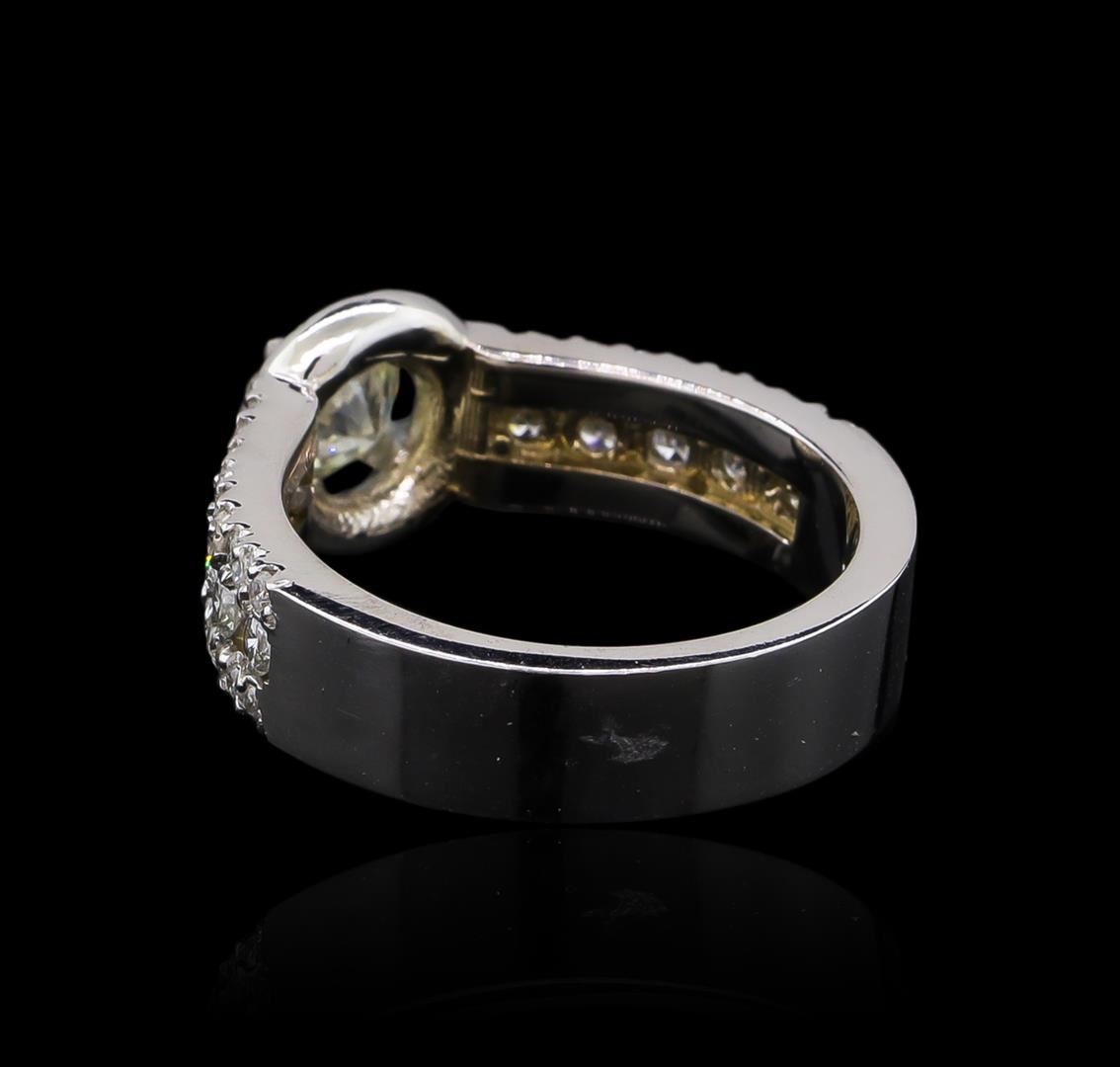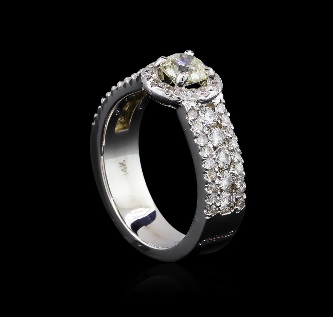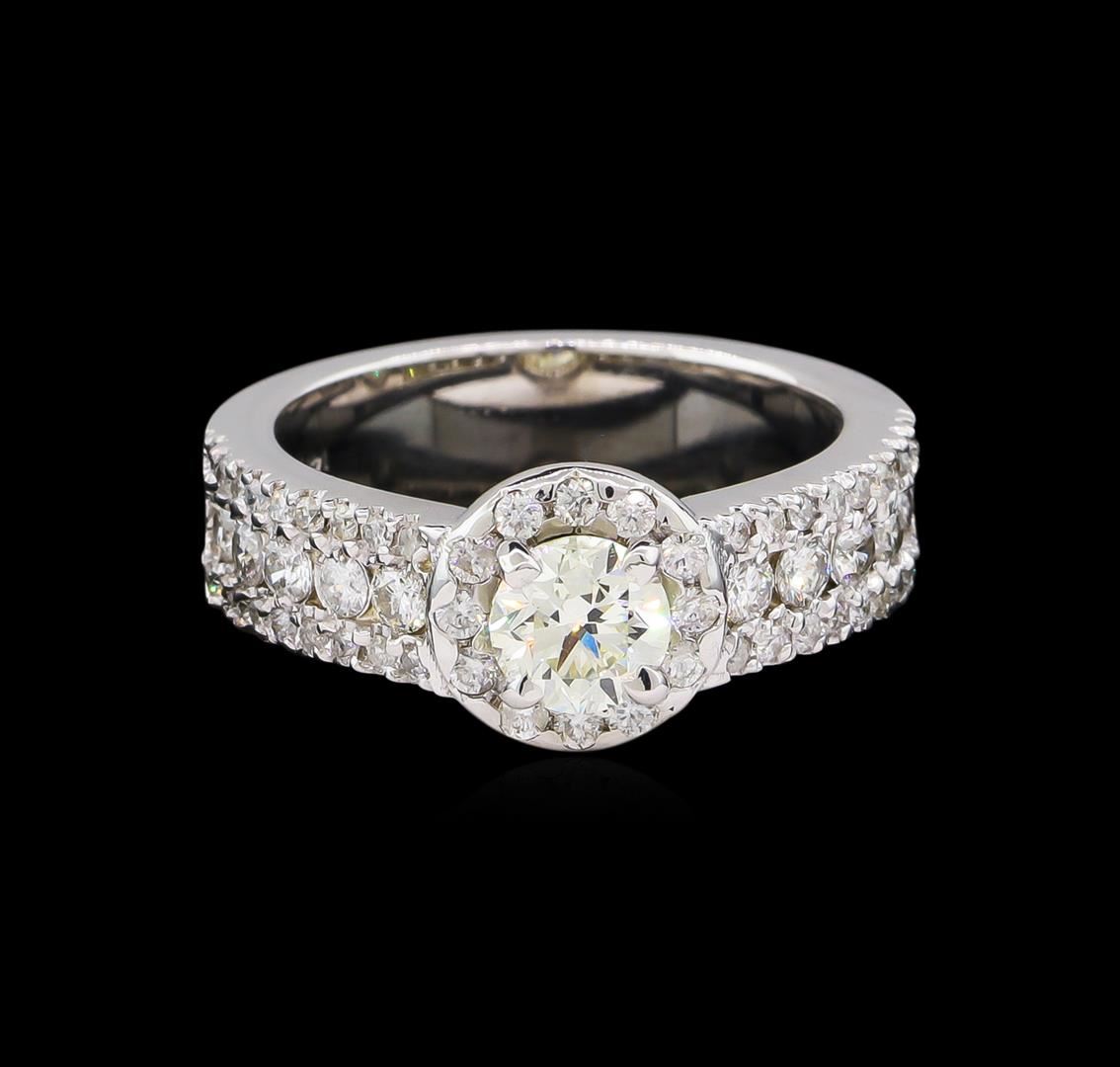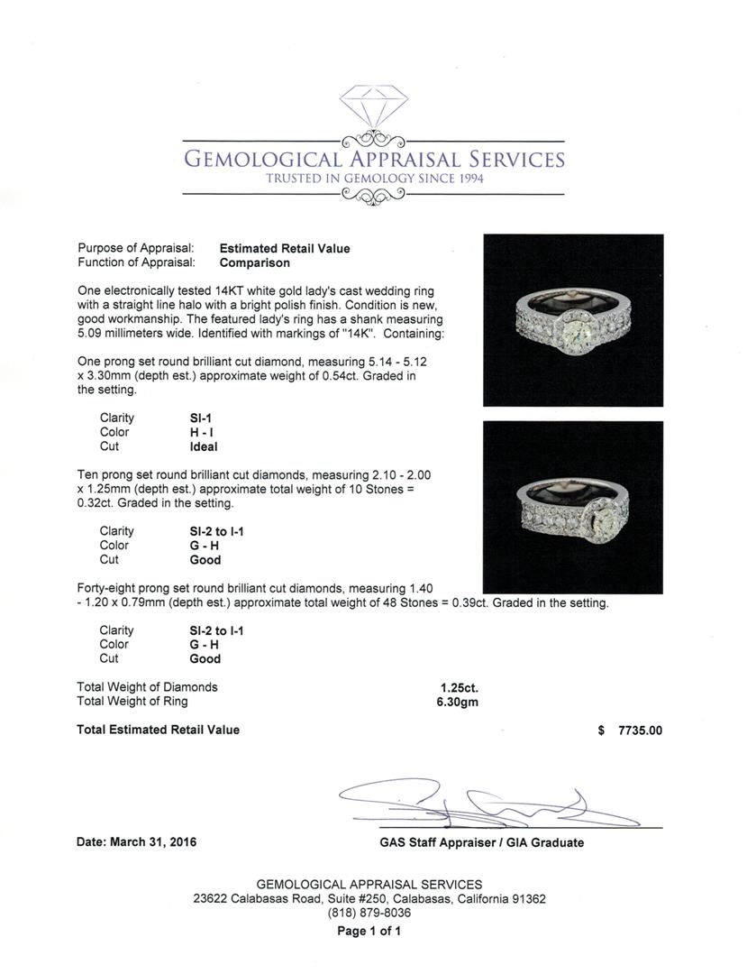 One electronically tested 14KT white gold lady's cast wedding ring with a straight line halo with a bright polish finish. The featured lady's ring has a shank measuring 5.09 millimeters wide. Identified with markings of "14K". Condition is new, good workmanship. Containing: One prong set round brilliant cut diamond, measuring 5.14 - 5.12 x 3.30mm (depth est.) approximate weight of 0.54ct. Graded in the setting. Clarity: SI-1. Color: H - I. Cut Ideal Ten prong set round brilliant cut diamonds, measuring 2.10 - 2.00 x 1.25mm (depth est.) approximate total weight of 10 Stones = 0.32ct. Graded in the setting. Clarity: SI-2 to I-1. Color: G - Good Forty-Eight prong set round brilliant cut diamonds, measuring 1.40 - 1.20 x 0.79mm (depth est.) approximate total weight of 48 Stones = 0.39ct. Graded in the setting. Clarity: SI-2 to I-1. Color: G - Good. Total Weight of Diamonds 1.25ct. Total Weight of Ring 6.30gm GAS Appraised.