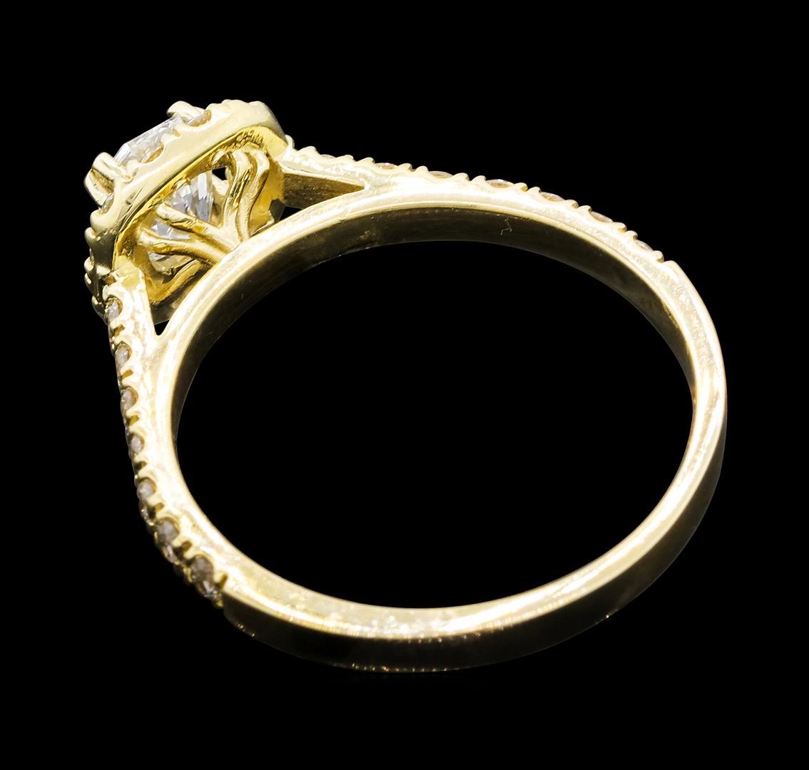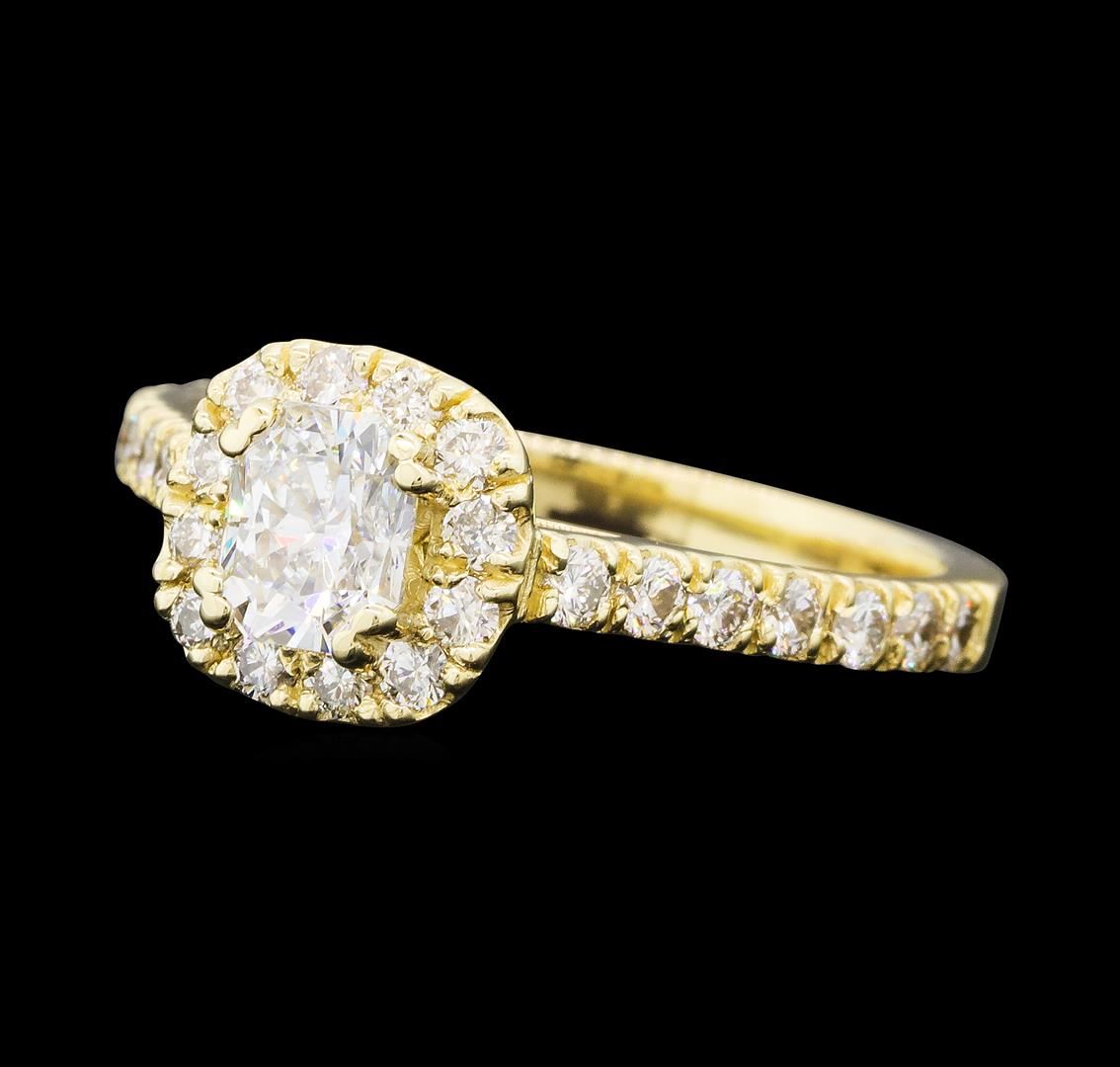 One electronically tested 14KT yellow gold lady's cast wedding ring with a cathedral shank with a halo with a bright polish finish. The featured lady's ring has a shank measuring 2.10 millimeters wide. Identified with markings of '14K'. Condition is new, good workmanship. Containing: One prong set princess cut diamond, measuring 5.45 x 4.56 x 3.42mm (depth est.) approximate weight of 0.70ct. Graded in the setting. Color H Clarity VS-2 Cut Very Good Twenty-Six prong set round brilliant cut diamonds, measuring 1.80 - 1.75 x 1.10mm (depth est.) approximate total weight of 26 Stones = 0.55ct. Graded in the setting. Color H - I Clarity VS-2 to SI-2 Cut Good. Total Weight of Diamonds 1.25ct.. Total Weight of Ring 2.70gm GAS Appraised at $7,760.00.