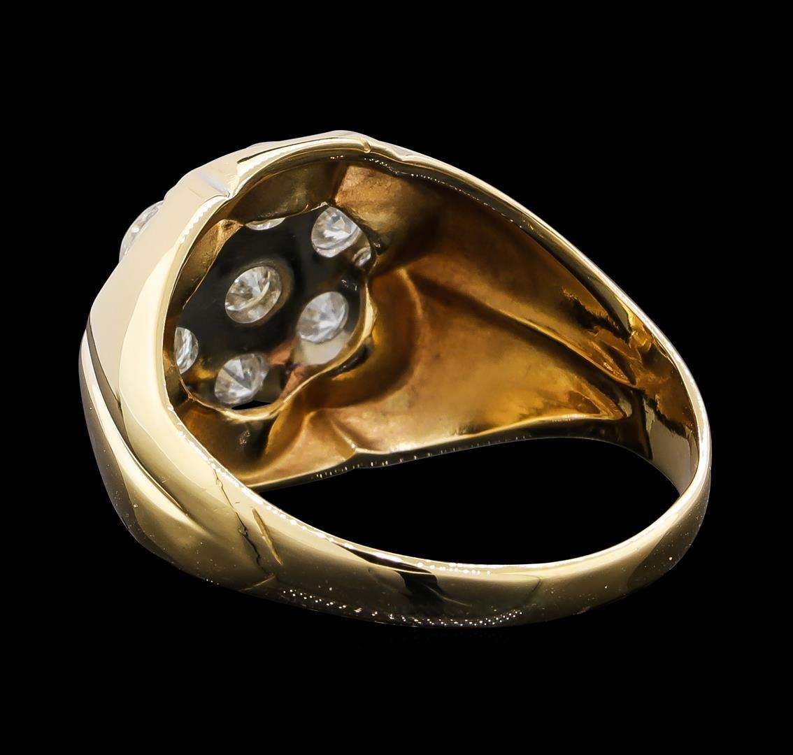One electronically tested 14KT yellow and white gold lady's combination cast & assembled fashion ring with a tapered shank with a bright polish finish. The featured lady's ring has a shank measuring 2.30 millimeters wide. Identified with markings of '14K'. Condition is like new, good workmanship. Containing: Seven prong set round brilliant cut diamonds, measuring 3.70 - 3.50 x 2.23mm (depth est.) approximate total weight of 7 Stones = 1.25ct. Graded in the setting. Clarity SI-1 to SI-2. Color: H - I Cut Good. Total Weight of Diamonds 1.25ct.. Total Weight of Ring 4.40gm. GAS Appraised at $3,485.00.