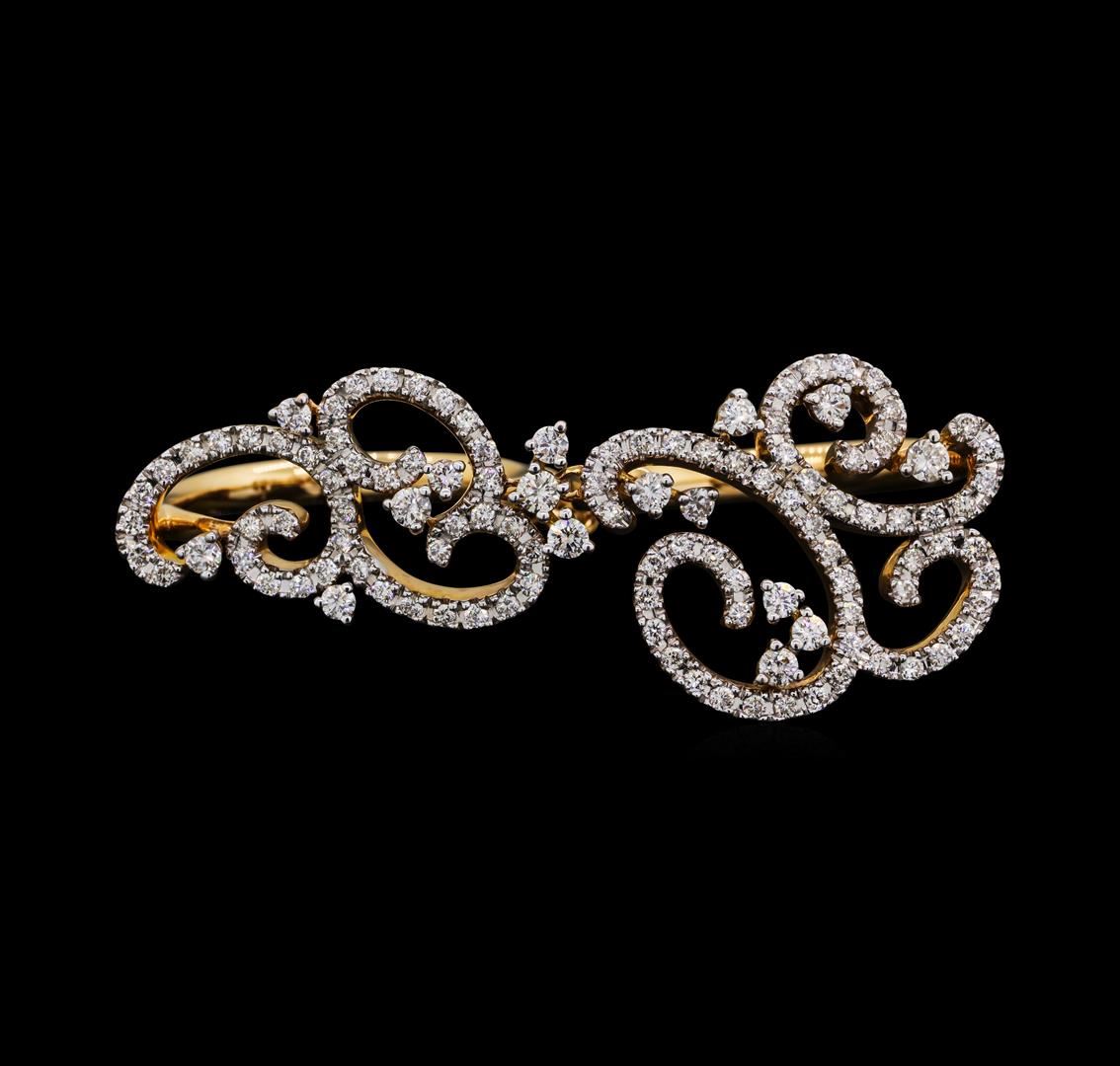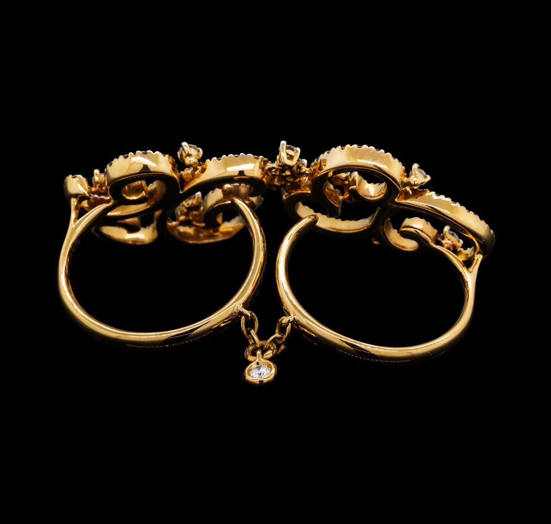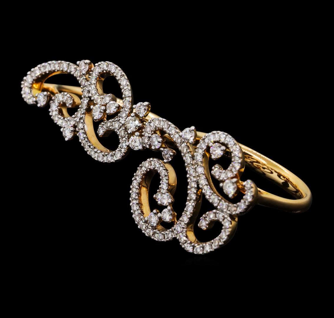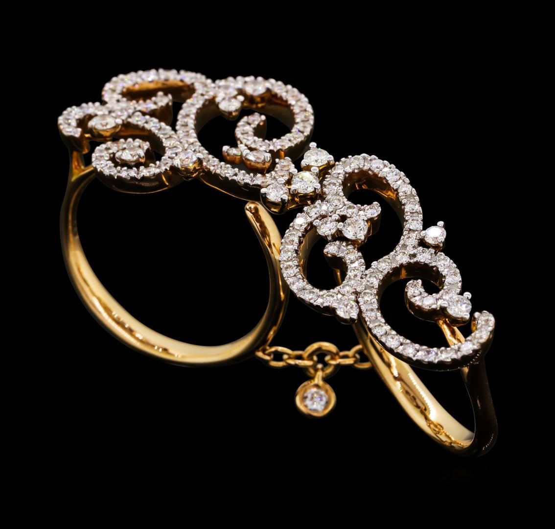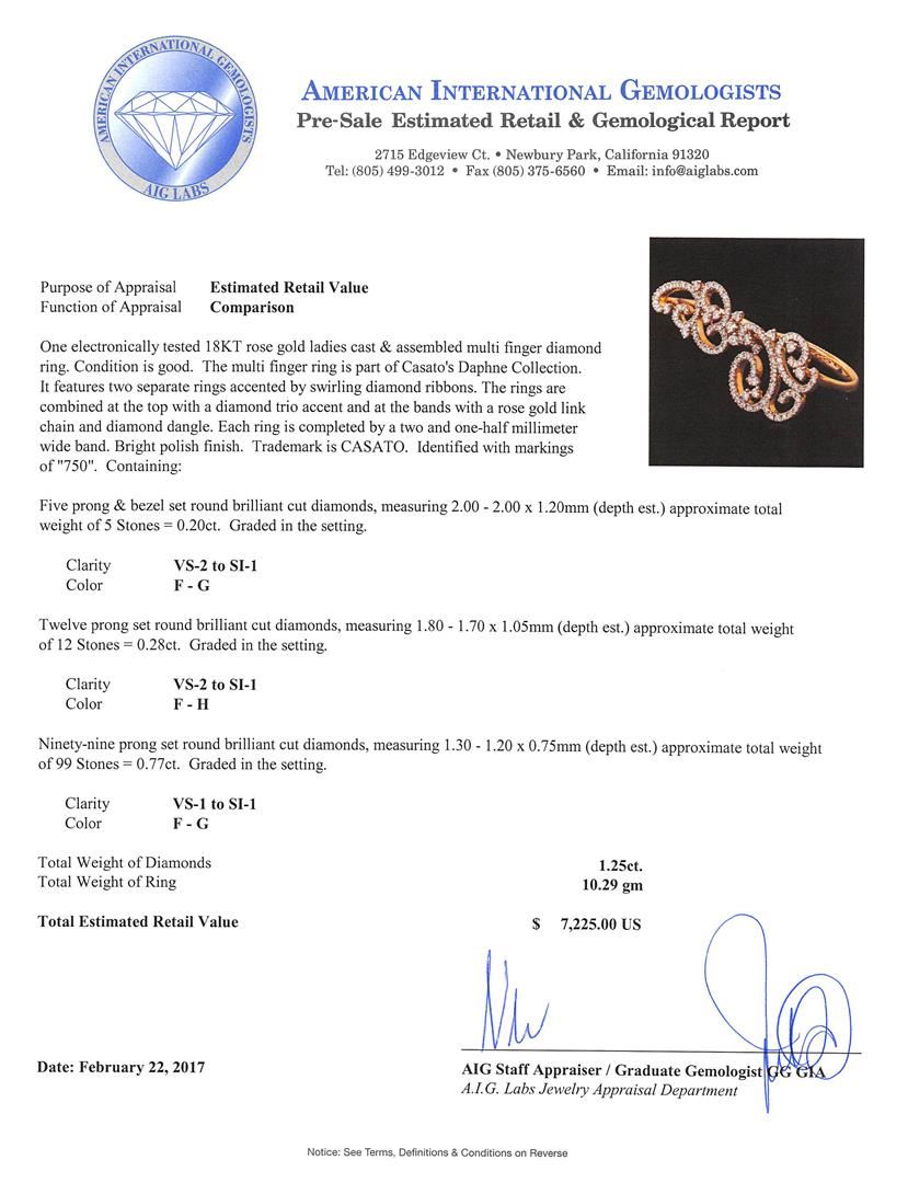 One electronically tested 18KT rose gold ladies cast & assembled multi finger diamond ring. The multi finger ring is part of Casato's Daphne Collection. It features two separate rings accented by swirling diamond ribbons. The rings are combined at the top with a diamond trio accent and at the bands with a rose gold link chain and diamond dangle. Each ring is completed by a two and one-half millimeter wide band. Bright polish finish. Trademark is CASATO. Identified with markings of '750'. Condition is good. Containing: Five prong & bezel set round brilliant cut diamonds, measuring 2.00 - 2.00 x 1.20mm (depth est.) approximate total weight of 5 Stones = 0.20ct. Graded in the setting. Clarity VS-2 to SI-1. Color: F - G Twelve prong set round brilliant cut diamonds, measuring 1.80 - 1.70 x 1.05mm (depth est.) approximate total weight of 12 Stones = 0.28ct. Graded in the setting. Clarity VS-2 to SI-1. Color: F - H Ninety-Nine prong set round brilliant cut diamonds, measuring 1.30 - 1.20 x 0.75mm (depth est.) approximate total weight of 99 Stones = 0.77ct. Graded in the setting. Clarity VS-1 to SI-1. Color: F - G. Total Weight of Diamonds 1.25ct.. Total Weight of Ring 10.29gm. AIG Appraised at $7,225.00.