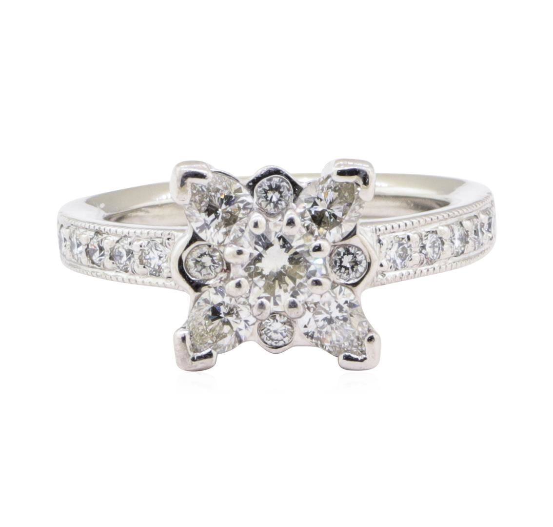 One electronically tested platinum ladies cast diamond ring. The ring features a stylized diamond floret supported by diamond set shoulders, completed by a two millimeter wide band. Bright polish finish with milgrain detailing. Identified with markings of "PLAT". Condition is good. Containing: One prong set round brilliant cut diamond, measuring 4.20 - 4.18 x 2.35mm (depth est.) approximate weight of 0.28ct. Graded in the setting. Clarity VS-2 Color G Four prong set pear shaped cut diamonds, measuring 4.00 x 3.00 x 1.89mm (depth est.) approximate total weight of 4 Stones = 0.60ct. Graded in the setting. Clarity VS-1 to VS-2 Color G - H Fourteen bead & bezel set round brilliant cut diamonds, measuring 1.80 - 1.70 x 1.05mm (depth est.) approximate total weight of 14 Stones = 0.37ct. Graded in the setting. Clarity VS-1 to VS-2 Color G - H Total Weight of Diamonds 1.25 ct. Total Weight of Ring 8.55 gm Estimated Retail Value $ 7,940.00 US