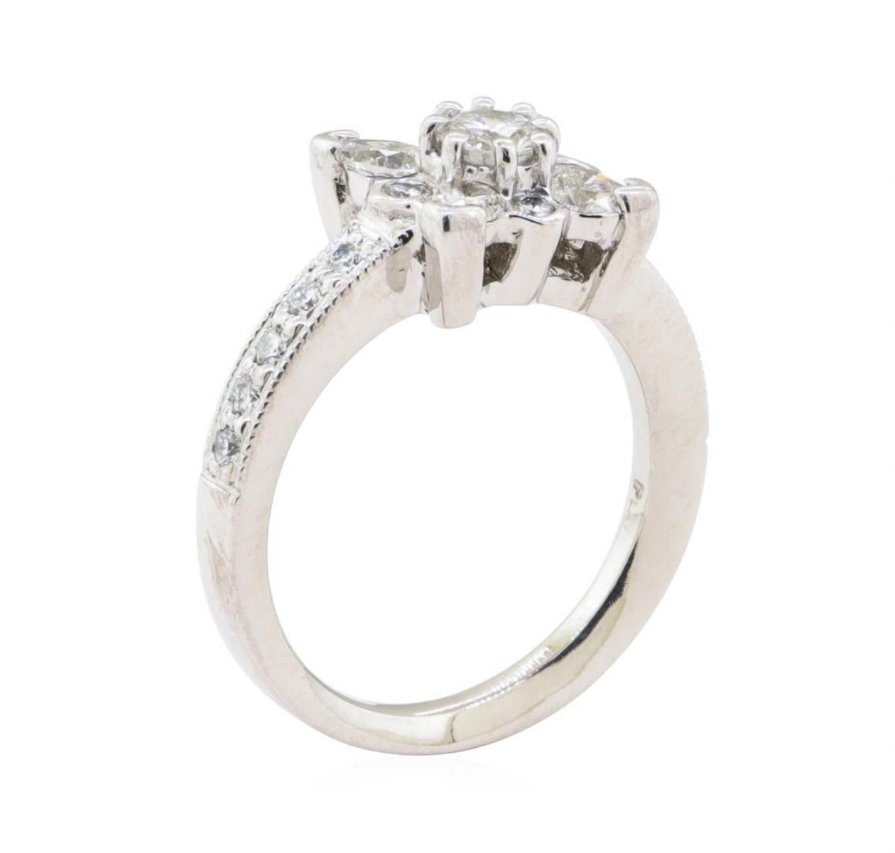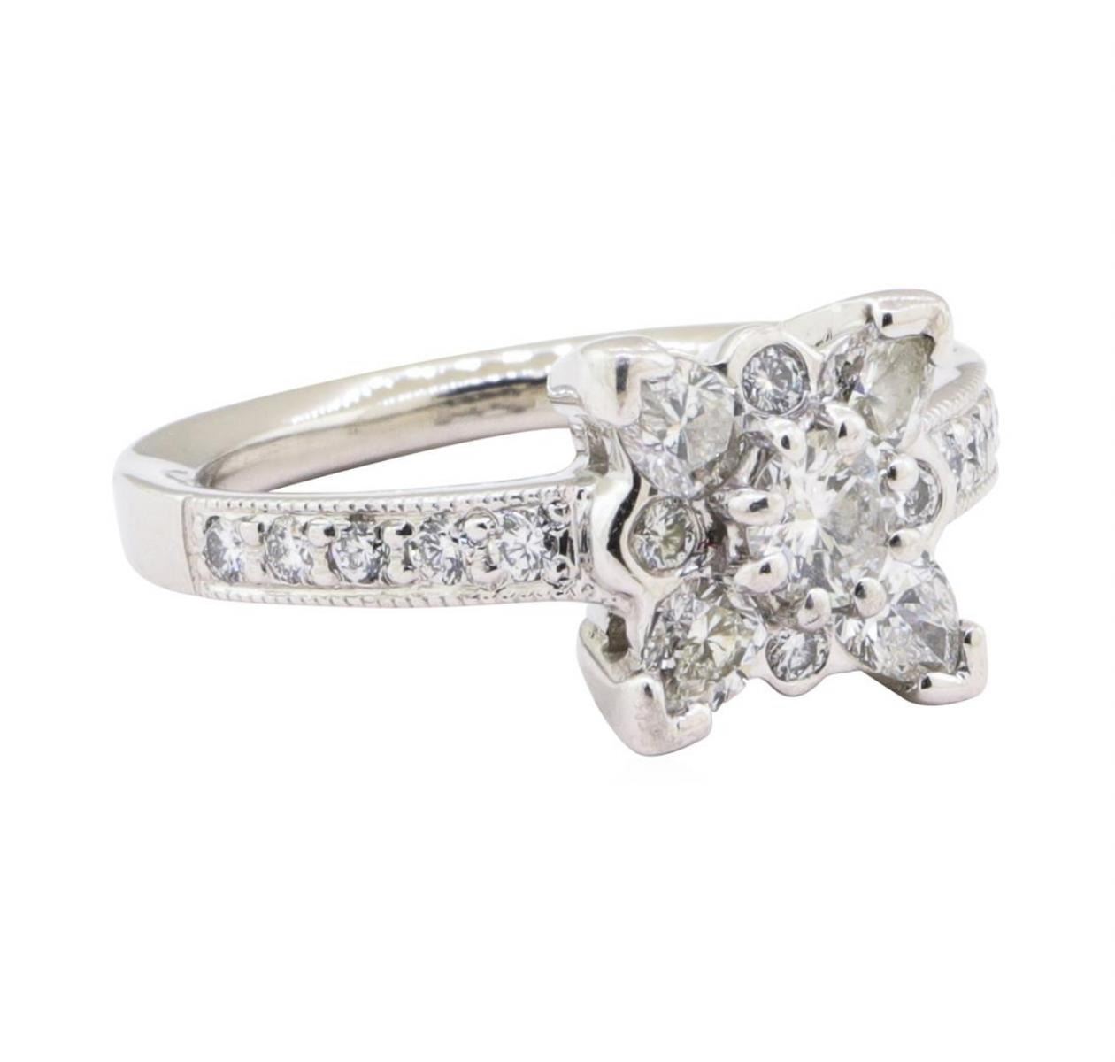 One electronically tested platinum ladies cast diamond ring. The ring features a stylized diamond floret supported by diamond set shoulders, completed by a two millimeter wide band. Bright polish finish with milgrain detailing. Identified with markings of "PLAT". Condition is good. Containing: One prong set round brilliant cut diamond, measuring 4.20 - 4.18 x 2.35mm (depth est.) approximate weight of 0.28ct. Graded in the setting. Clarity VS-2 Color G Four prong set pear shaped cut diamonds, measuring 4.00 x 3.00 x 1.89mm (depth est.) approximate total weight of 4 Stones = 0.60ct. Graded in the setting. Clarity VS-1 to VS-2 Color G - H Fourteen bead & bezel set round brilliant cut diamonds, measuring 1.80 - 1.70 x 1.05mm (depth est.) approximate total weight of 14 Stones = 0.37ct. Graded in the setting. Clarity VS-1 to VS-2 Color G - H Total Weight of Diamonds 1.25 ct. Total Weight of Ring 8.55 gm Estimated Retail Value $ 7,940.00 US
