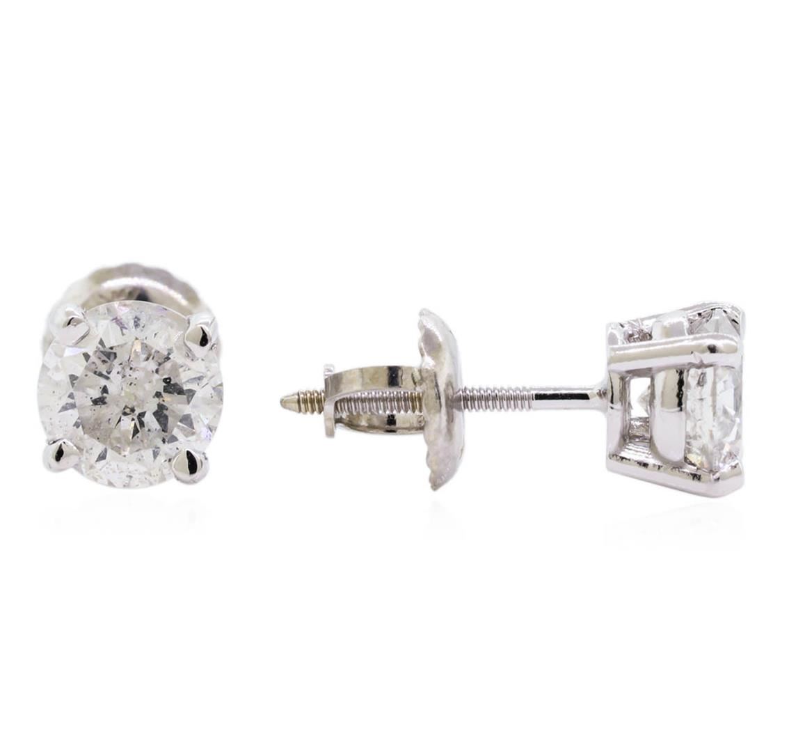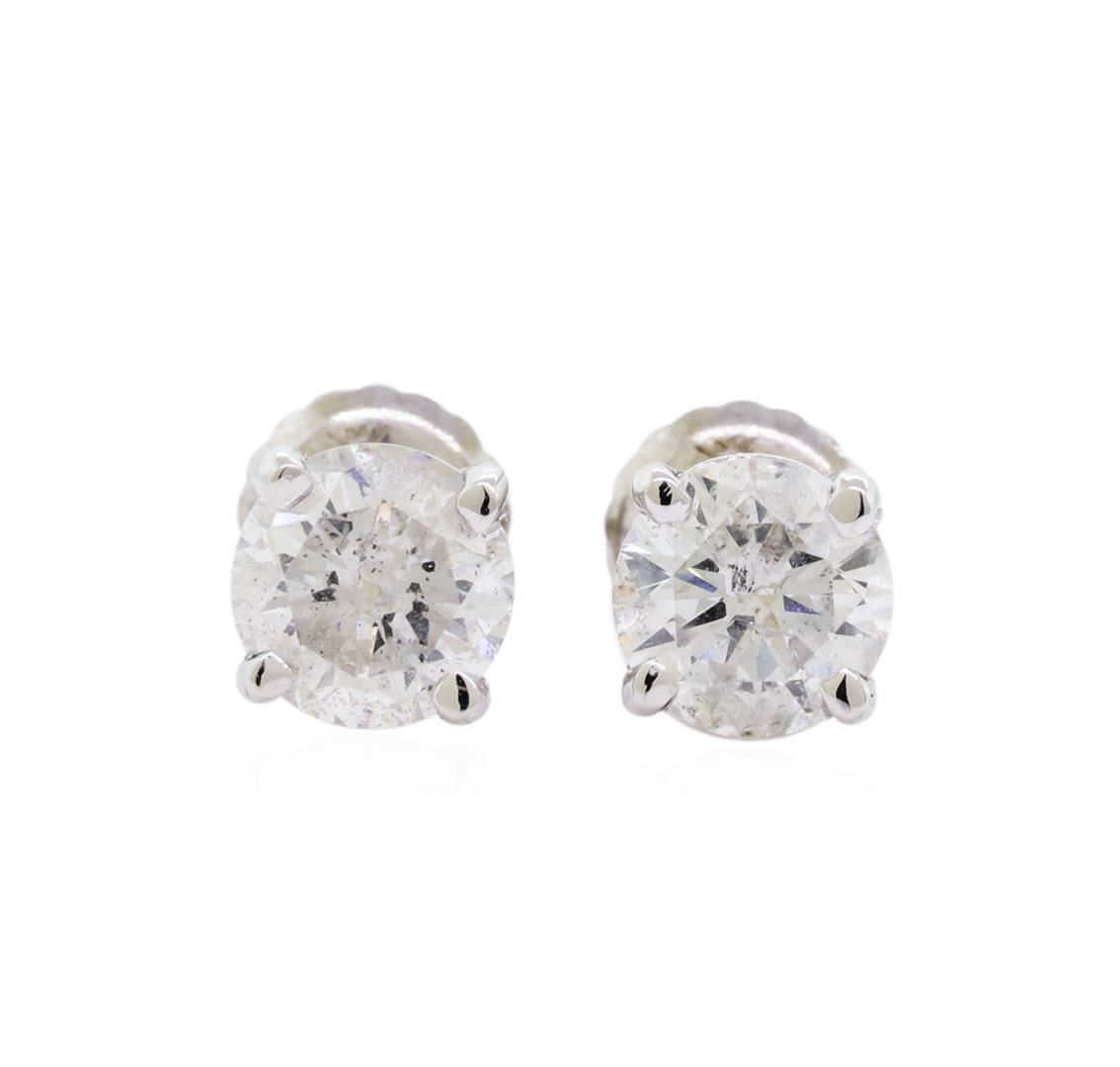 One pair electronically tested 14KT white gold lady's combination cast & assembled stud earrings with threaded posts and screw-on/screw-off backs with a bright polish finish. Identified with markings of "14K". Condition is new, good workmanship. Containing: Two prong set round brilliant cut diamonds, measuring 5.46 - 5.39 x 3.42mm (depth est.) approximate total weight of 2 Stones = 1.25ct. Graded in the setting. Clarity: SI-2. Color: G - Good. Total Weight of Diamonds 1.25ct. Total Weight of Earrings 1.20gm. GAS Appraised at $8,980.00.