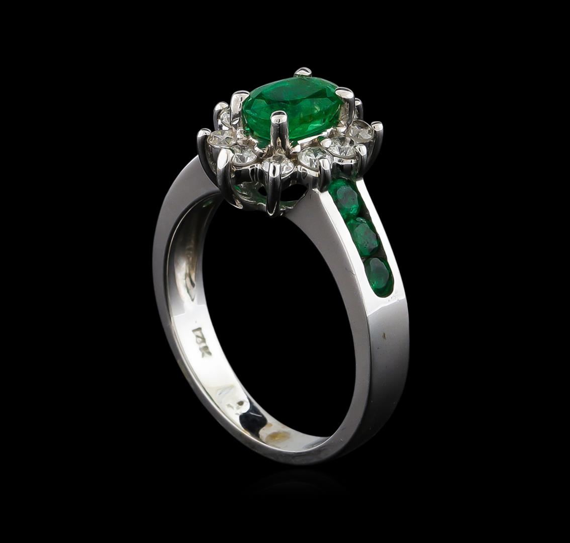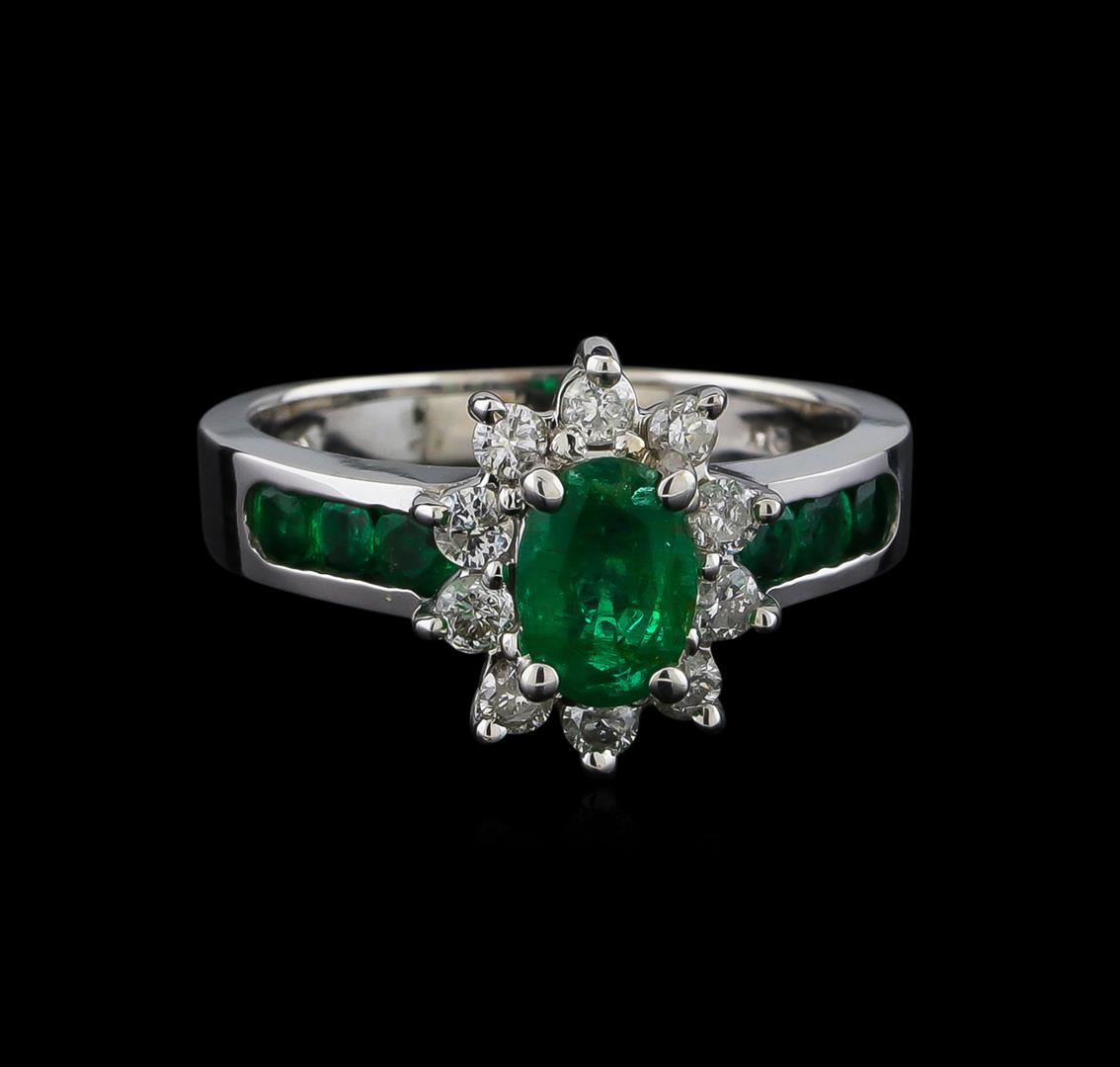One electronically tested 14KT white gold lady's cast fashion ring with a basket halo with a bright polish finish. The featured lady's ring has a shank measuring 2.83 millimeters wide. Identified with markings of "14K". Condition is new, good workmanship. Containing: One prong set oval modified brilliant cut natural emerald, measuring 7.00 x 5.01 x 3.62mm, 4%. bulge factor, approximate weight of 0.75ct., clarity is moderately included, type III, medium dark, moderately strong, green color, (GIA G 6/4), cut is good. Transmitting light somewhat diffusely, semi-transparent to translucent. Naturally occurring internal & external characteristics are present. Indications of oil residue. Graded in the setting. Six channel set round modified brilliant cut natural emeralds, measuring 2.90 - 2.70 x 1.82 mm, approximate total weight of 0.50ct., clarity is slightly included, type III, medium dark, moderately strong, green color, (GIA G 6/4), cut is good. Transmitting light with a minimum of distortion, transparent. Naturally occurring internal & external characteristics are present. Indications of oil residue. Graded in the setting. Ten prong set round brilliant cut diamonds, measuring 2.20 - 2.15 x 1.35mm (depth est.) approximate total weight of 10 Stones = 0.39ct. Graded in the setting. Clarity: SI-2 to I-1. Color: H - I. Cut Good. Total Weight of Colored Stones 1.25ct. Total Weight of Diamonds 0.39ct. Total Weight of Ring 4.80gm. GAS Appraised at $2,400.00.