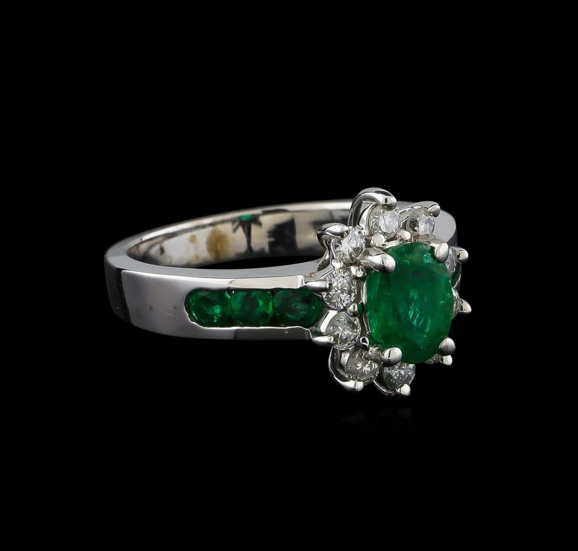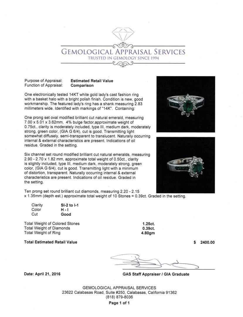 One electronically tested 14KT white gold lady's cast fashion ring with a basket halo with a bright polish finish. The featured lady's ring has a shank measuring 2.83 millimeters wide. Identified with markings of "14K". Condition is new, good workmanship. Containing: One prong set oval modified brilliant cut natural emerald, measuring 7.00 x 5.01 x 3.62mm, 4%. bulge factor, approximate weight of 0.75ct., clarity is moderately included, type III, medium dark, moderately strong, green color, (GIA G 6/4), cut is good. Transmitting light somewhat diffusely, semi-transparent to translucent. Naturally occurring internal & external characteristics are present. Indications of oil residue. Graded in the setting. Six channel set round modified brilliant cut natural emeralds, measuring 2.90 - 2.70 x 1.82 mm, approximate total weight of 0.50ct., clarity is slightly included, type III, medium dark, moderately strong, green color, (GIA G 6/4), cut is good. Transmitting light with a minimum of distortion, transparent. Naturally occurring internal & external characteristics are present. Indications of oil residue. Graded in the setting. Ten prong set round brilliant cut diamonds, measuring 2.20 - 2.15 x 1.35mm (depth est.) approximate total weight of 10 Stones = 0.39ct. Graded in the setting. Clarity: SI-2 to I-1. Color: H - I. Cut Good. Total Weight of Colored Stones 1.25ct. Total Weight of Diamonds 0.39ct. Total Weight of Ring 4.80gm. GAS Appraised at $2,400.00.