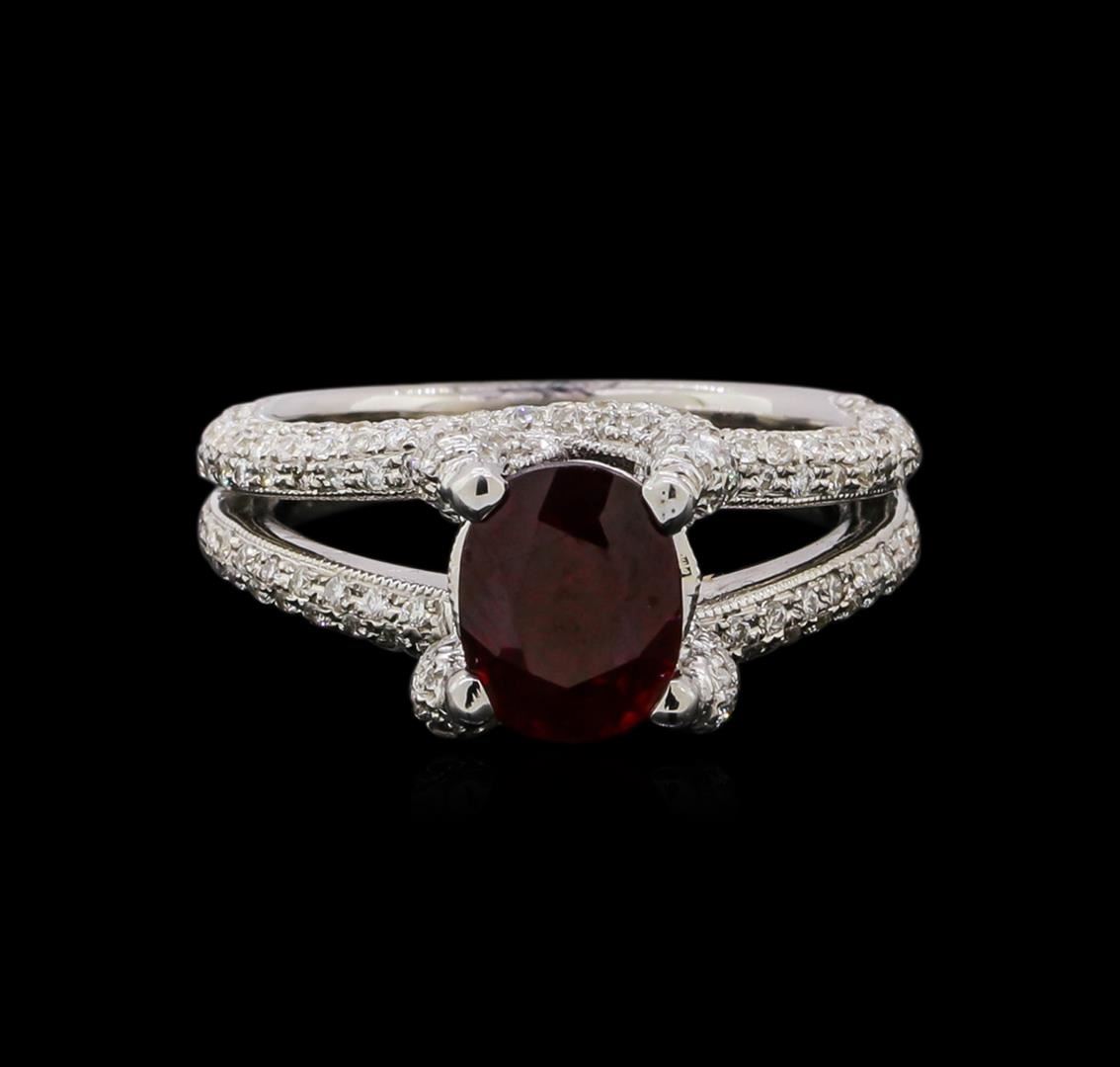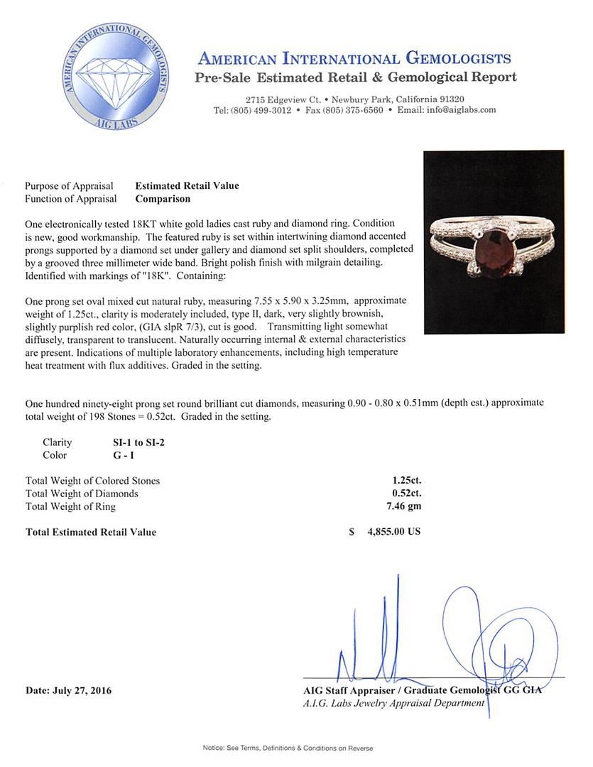 One electronically tested 18KT white gold ladies cast ruby and diamond ring. The featured ruby is set within intertwining diamond accented prongs supported by a diamond set under gallery and diamond set split shoulders, completed by a grooved three millimeter wide band. Bright polish finish with milgrain detailing. Identified with markings of '18K'. Condition is new, good workmanship. Containing: One prong set oval mixed cut natural ruby, measuring 7.55 x 5.90 x 3.25mm, approximate weight of 1.25ct., clarity is moderately included, type II, dark, very slightly brownish, slightly purplish red color, (GIA slpR 7/3), cut is good. Transmitting light somewhat diffusely, transparent to translucent. Naturally occurring internal & external characteristics are present. Indications of multiple laboratory enhancements, including high temperature heat treatment with flux additives. Graded in the setting. One Hundred Ninety-Eight prong set round brilliant cut diamonds, measuring 0.90 - 0.80 x 0.51mm (depth est.) approximate total weight of 198 Stones = 0.52ct. Graded in the setting. Clarity SI-1 to SI-2. Color: G - I. Total Weight of Colored Stones 1.25ct.. Total Weight of Diamonds 0.52ct.. Total Weight of Ring 7.46gm. AIG Appraised at $4,855.00.