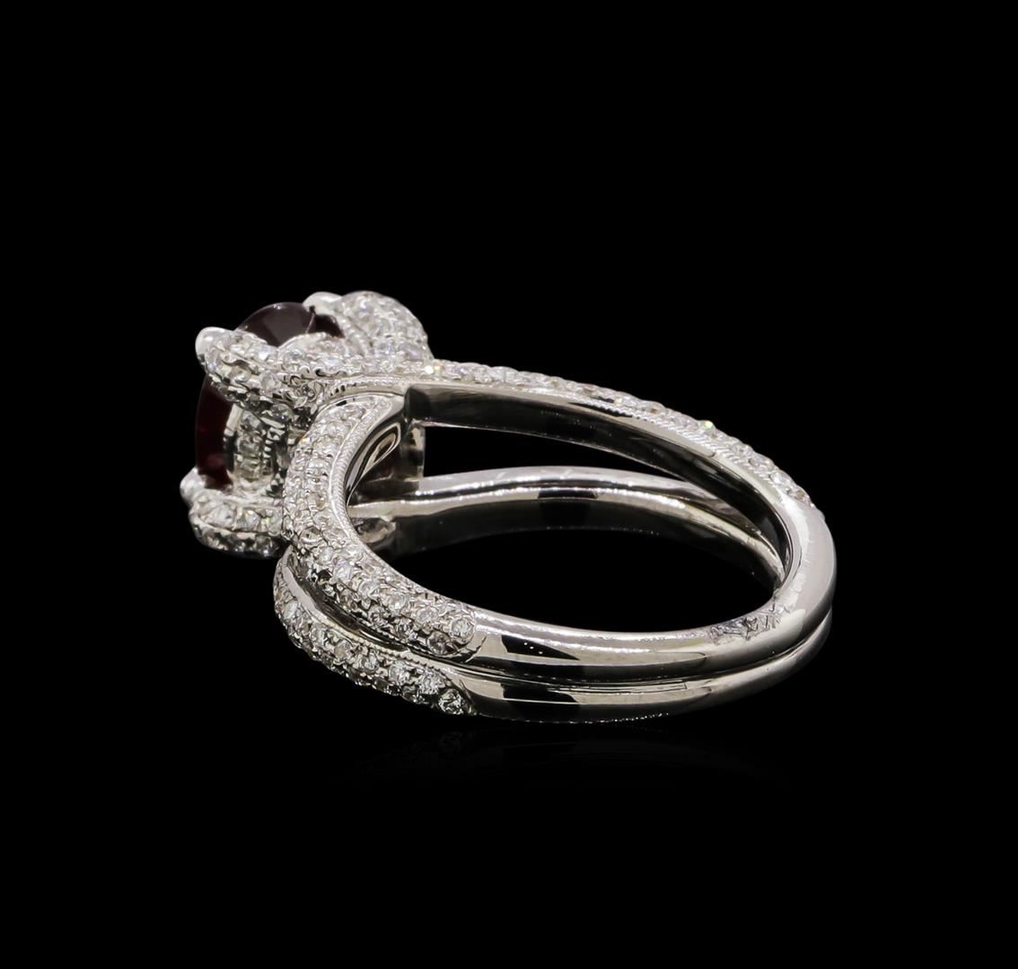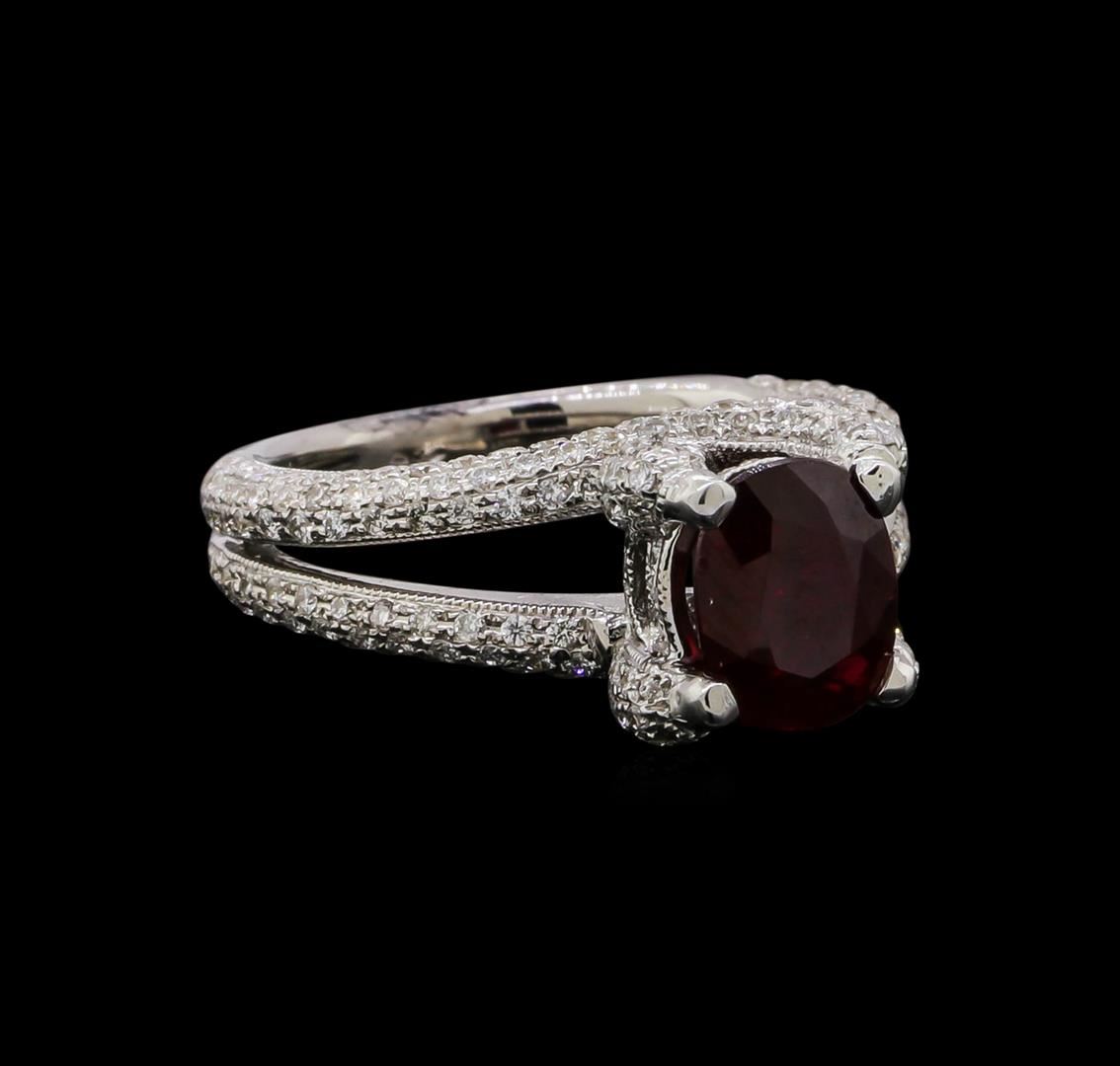 One electronically tested 18KT white gold ladies cast ruby and diamond ring. The featured ruby is set within intertwining diamond accented prongs supported by a diamond set under gallery and diamond set split shoulders, completed by a grooved three millimeter wide band. Bright polish finish with milgrain detailing. Identified with markings of '18K'. Condition is new, good workmanship. Containing: One prong set oval mixed cut natural ruby, measuring 7.55 x 5.90 x 3.25mm, approximate weight of 1.25ct., clarity is moderately included, type II, dark, very slightly brownish, slightly purplish red color, (GIA slpR 7/3), cut is good. Transmitting light somewhat diffusely, transparent to translucent. Naturally occurring internal & external characteristics are present. Indications of multiple laboratory enhancements, including high temperature heat treatment with flux additives. Graded in the setting. One Hundred Ninety-Eight prong set round brilliant cut diamonds, measuring 0.90 - 0.80 x 0.51mm (depth est.) approximate total weight of 198 Stones = 0.52ct. Graded in the setting. Clarity SI-1 to SI-2. Color: G - I. Total Weight of Colored Stones 1.25ct.. Total Weight of Diamonds 0.52ct.. Total Weight of Ring 7.46gm. AIG Appraised at $4,855.00.