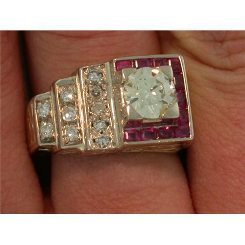 Fabulous retro ring from 1946. Nice stair step design features brilliant diamonds leading up to fine red rubies accenting a fantastic 1.25ct Old Euro cut diamond. These super gems are mounted in the finest of 14k yellow gold. The Retro explosion after World War II was in response to the privations and rationing by going big and flashy. Also as people looked to industry and technology to solve world problems, designs based on industrial and futuristic look came to the forefront of jewelry design. This signature piece weighs 12.4 grams and is a size 7 and can be sized to fit. See our ring sizing policy for details. Appraisal priced at $9,795.00.